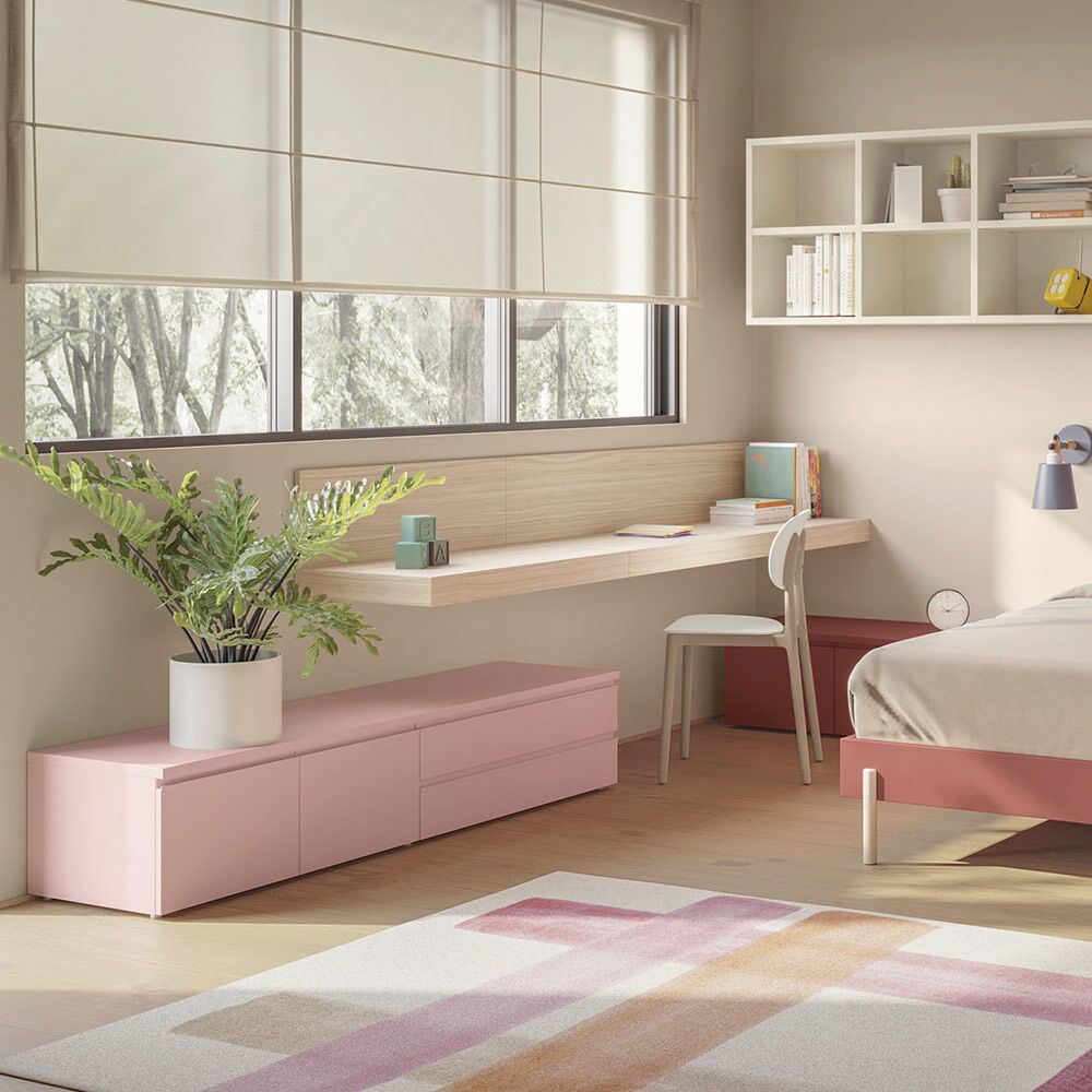 Le finiture proposte Noce naturale e Rosa bubble possono essere sostituire per creare una composizione in perfetta armonia con la propria cameretta.