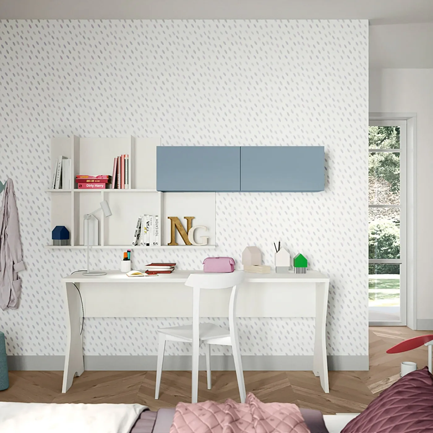 Scrivania per camerette per bambini e ragazzi dall'importante lunghezza e spaziosità del piano. Ideale per far concentrare i vostri ragazzi sullo studio o per lavorare.