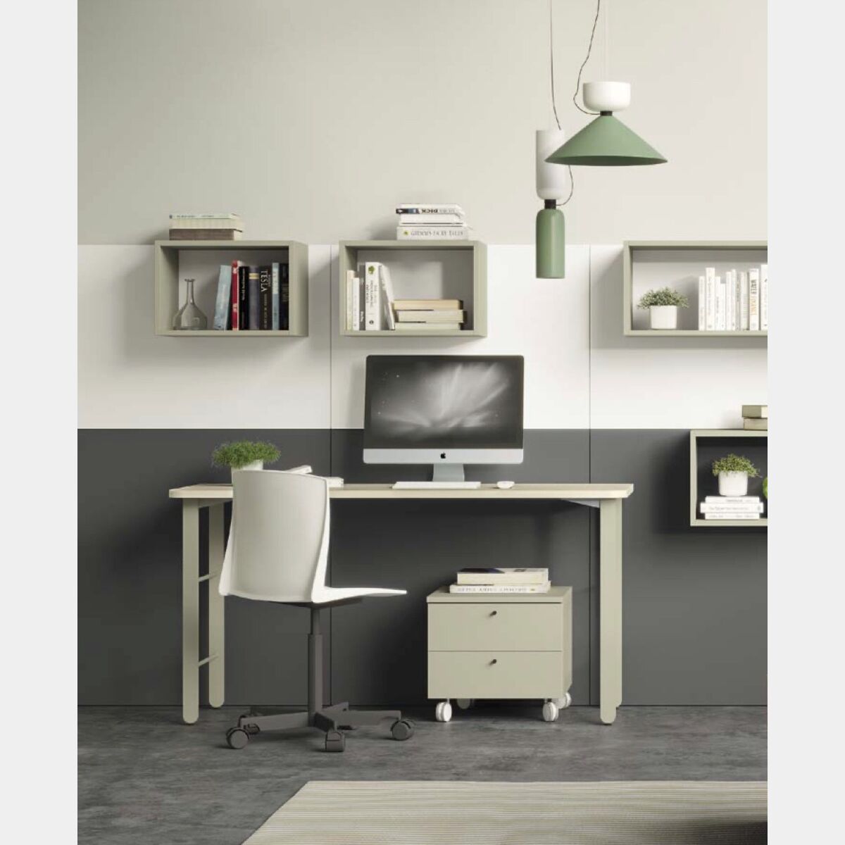 La scrivania presenta un piano in finitura Natural wood, delicata tonalità che consente un arredo pulito ed elegante, le gambe sono proposte in Domy: tinta neutra pastello che si abbina a colori neutri oppure accesi per creare contrasto.