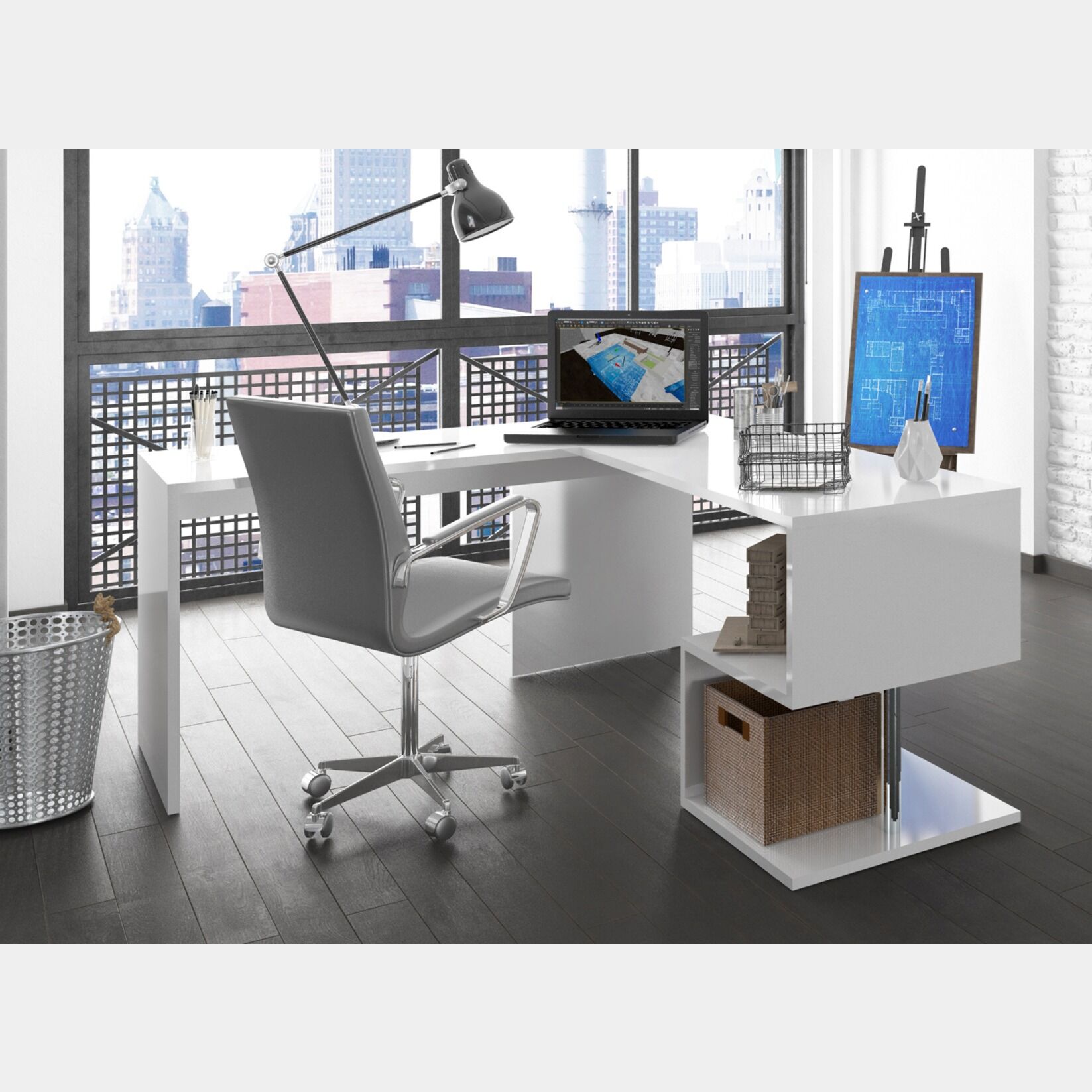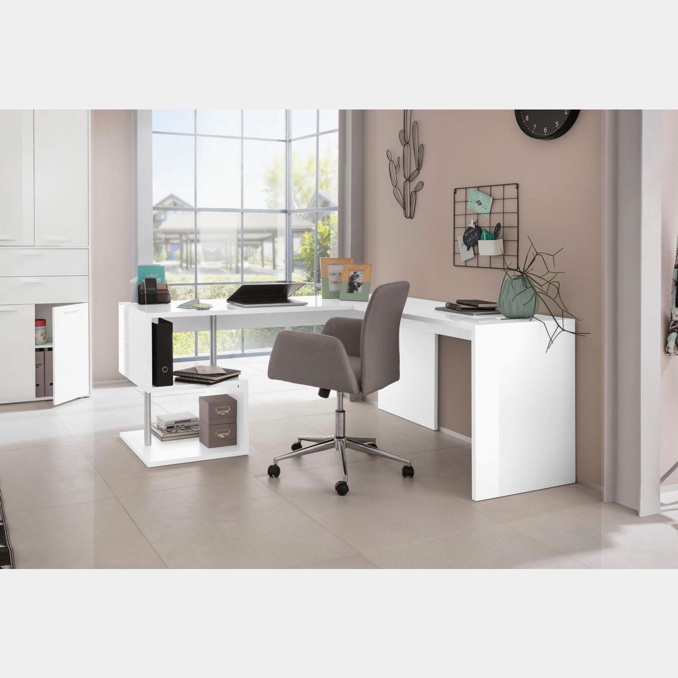 Scrivania moderna ad angolo con gamba "S", finitura bianca lucida