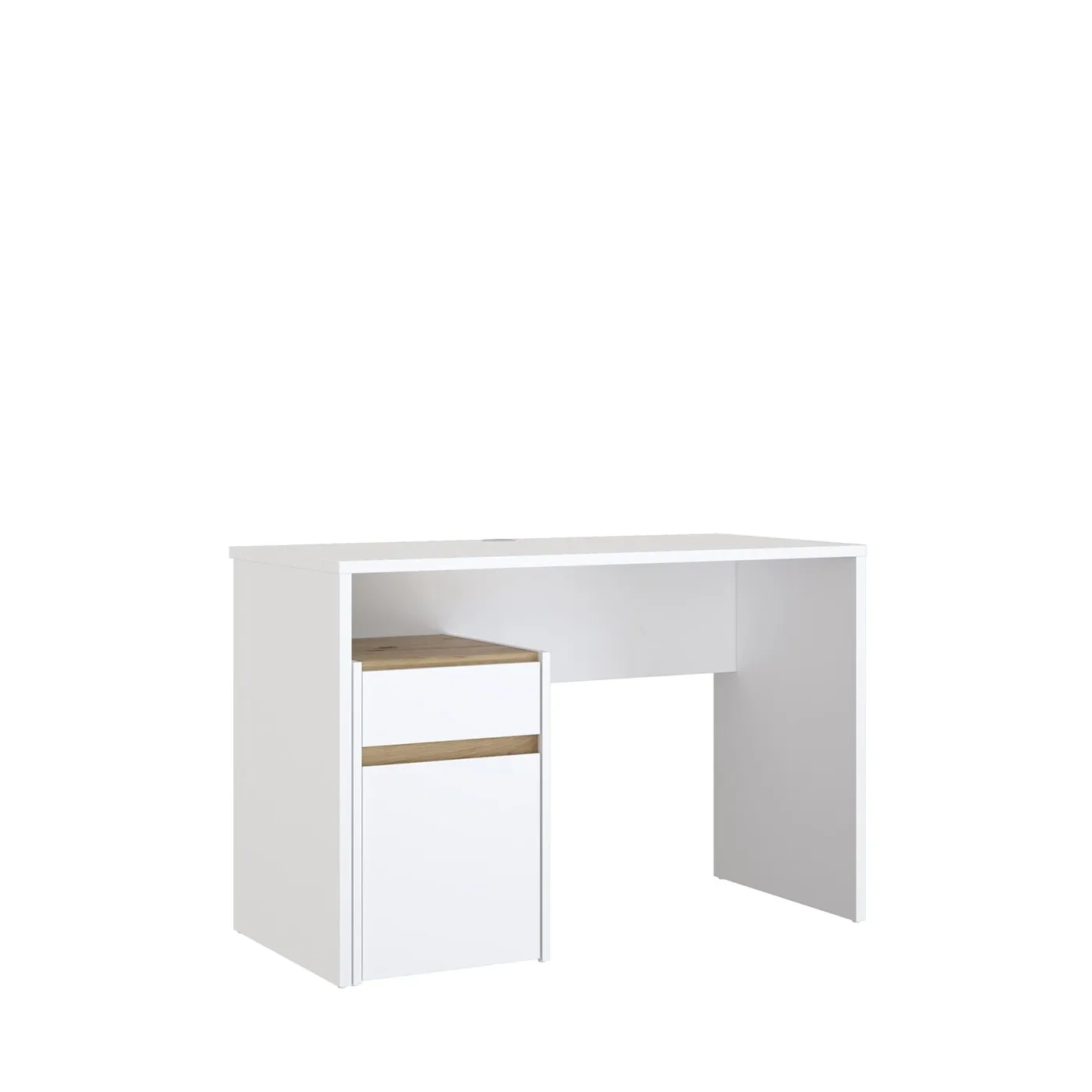 Scrivania con linee semplici, dotata di un modulo cassettiera, un cassetto e un anta, in promozione. Perfetta per uffici e camerette.
