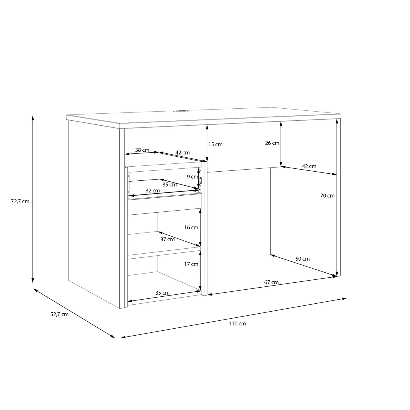 La scarivania, dotata di un modulo cassettiera posizionabile a destra o a sinistra, composto da un cassetto e un'anta con un ripiano interno offre una notevole capienza per documenti, libri e tutto il necessario durante le ore di studio.