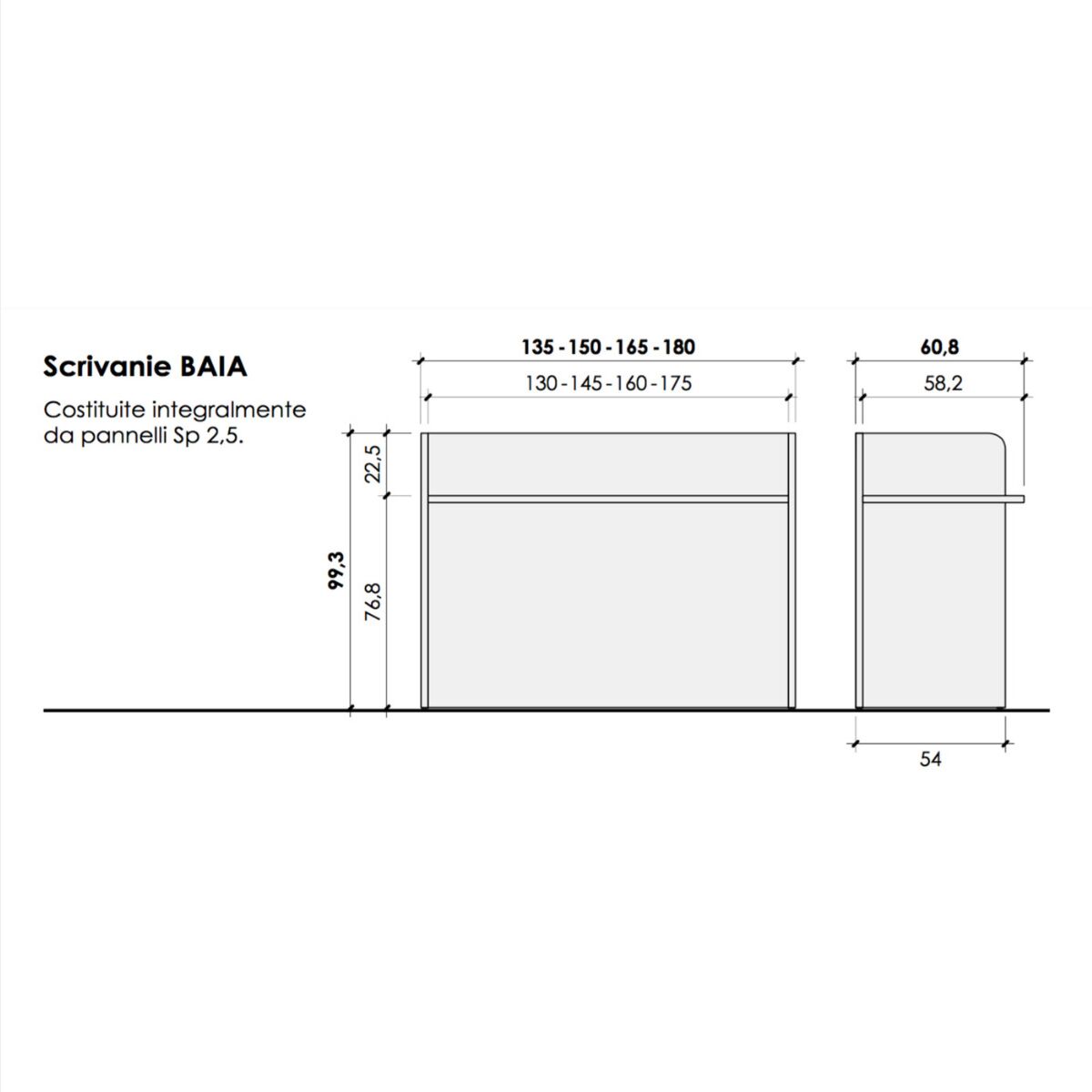 La scrivania è disponibile in quattro dimensioni: da 135 cm, da 150 cm, da 165 cm e da 180 cm, selezionabile tramite configuratore.