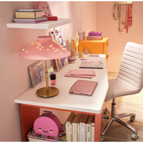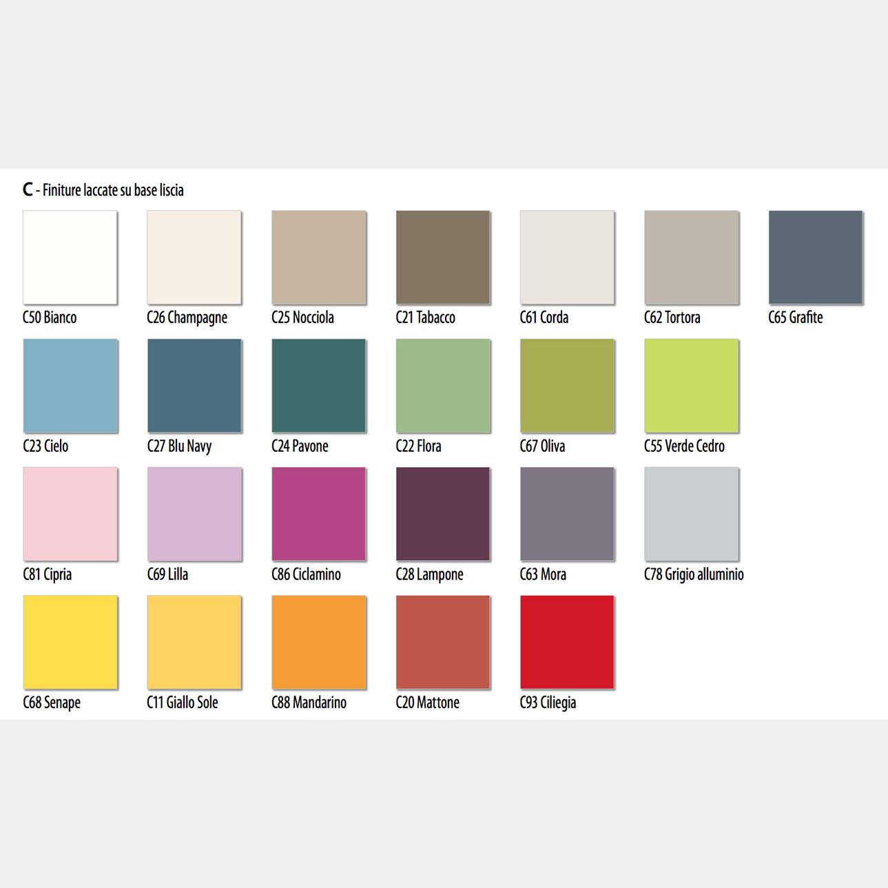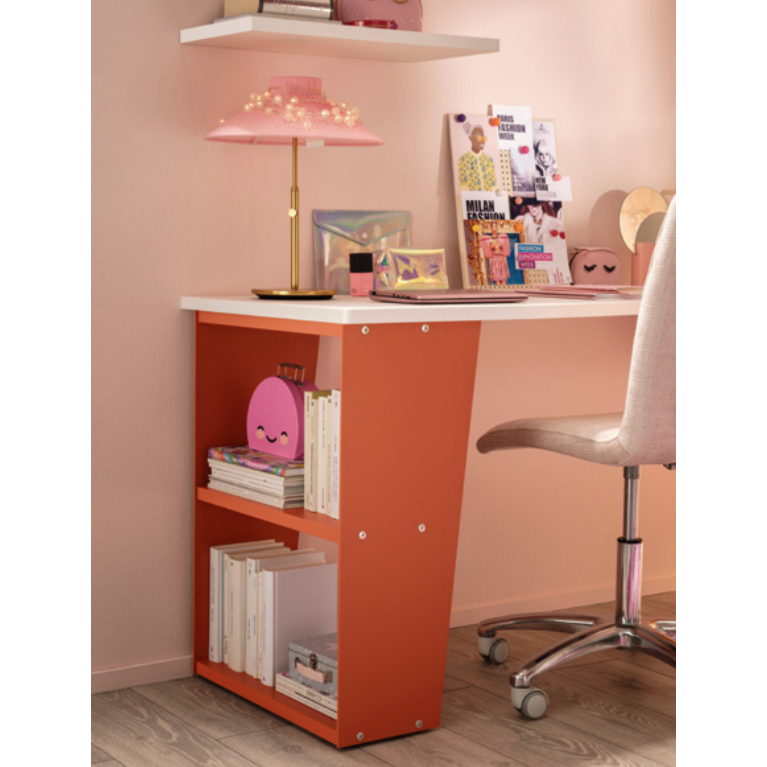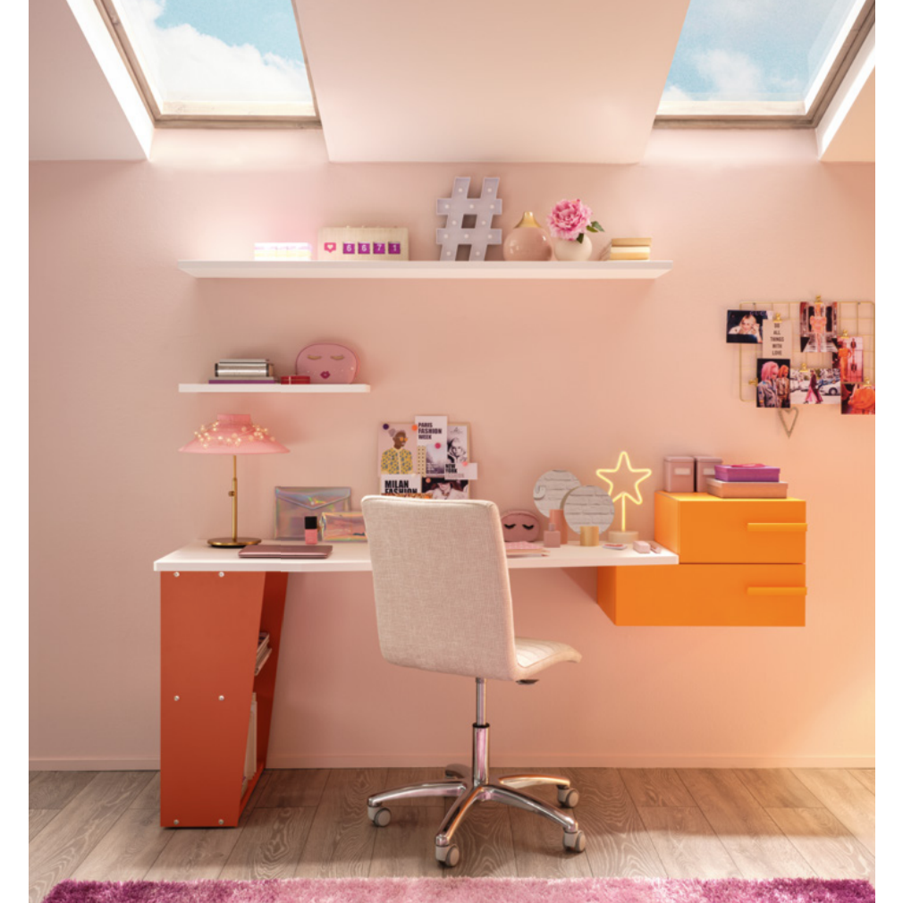 Le finiture proposte sono in Laccato mattone per la gamba, Laccato bianco per il piano e Mandarino laccato per i cassetti. Abbiamo a disposizione un'ampia ganma di colori (laccati o nobilitati) per assicurare una perfetta soluzione ad ogni cameretta.
