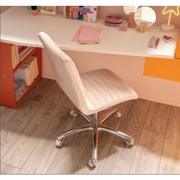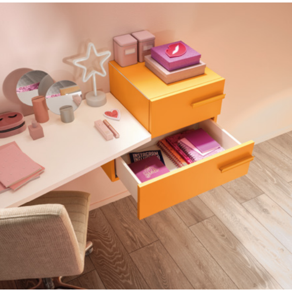 Questa zona studio diventa perfetta per ogni cameretta: 2 cassetti che diventano punto di appoggio per il piano scrivania che è retto sul lato opposto da un particolare fianco in metallo laccato.