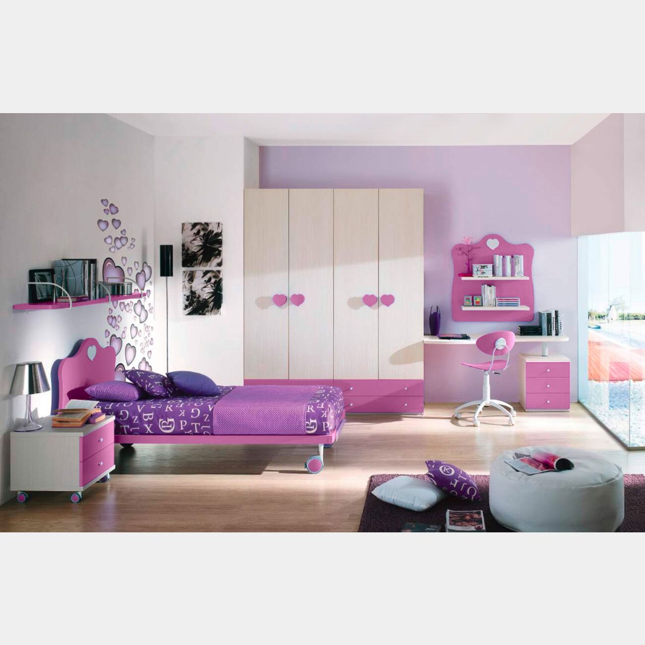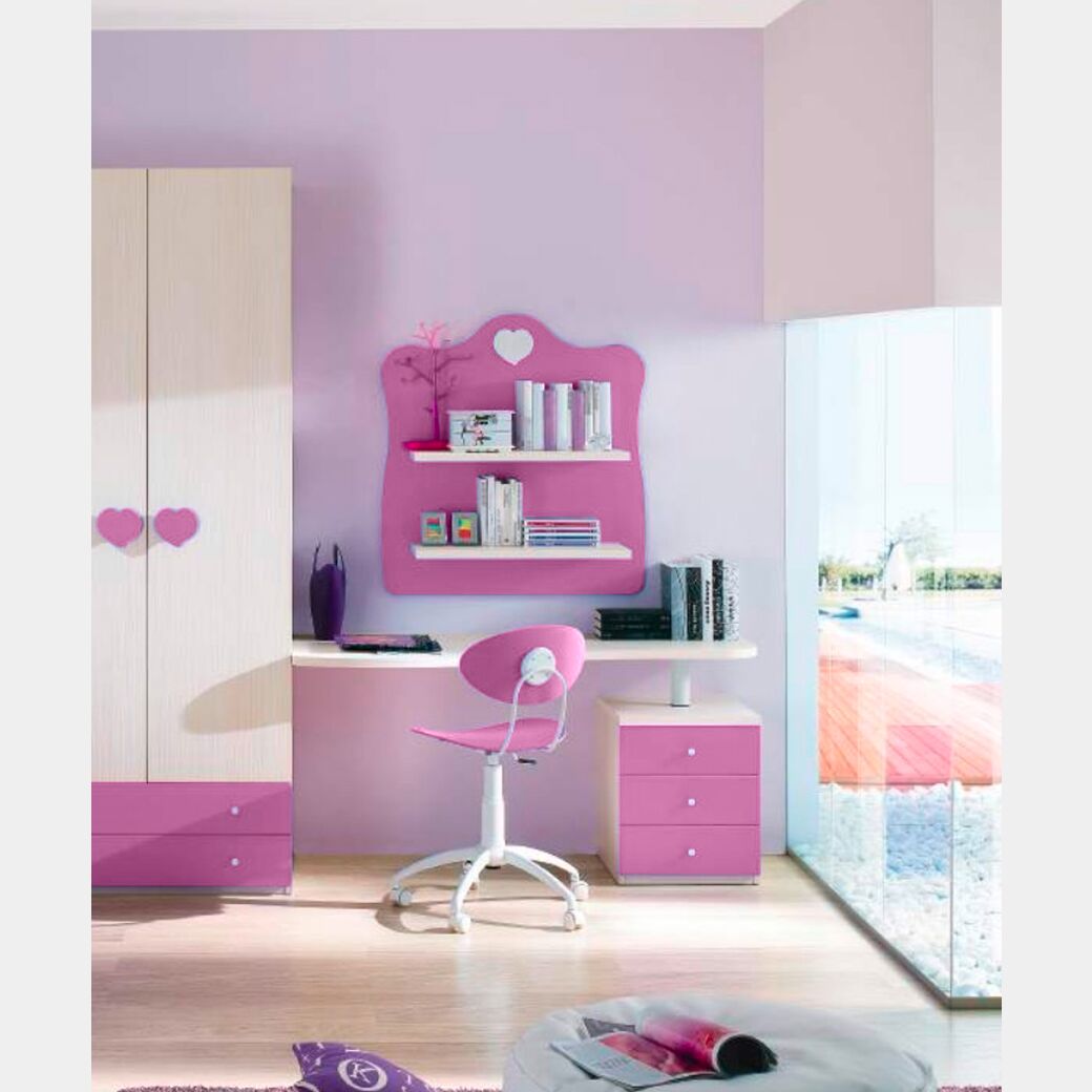 Finiture accese e contrasti importanti caratterizzano la zona studio. Il Ciclamino (laccato) si unisce al Larice per offrire un arredo caldo e di impatto. Grazie ad un'ampia scelta di colori è possibile personalizzarlo al meglio secondo i propri gusti, per questo la scrivania è adattabile ad ogni ambiente.