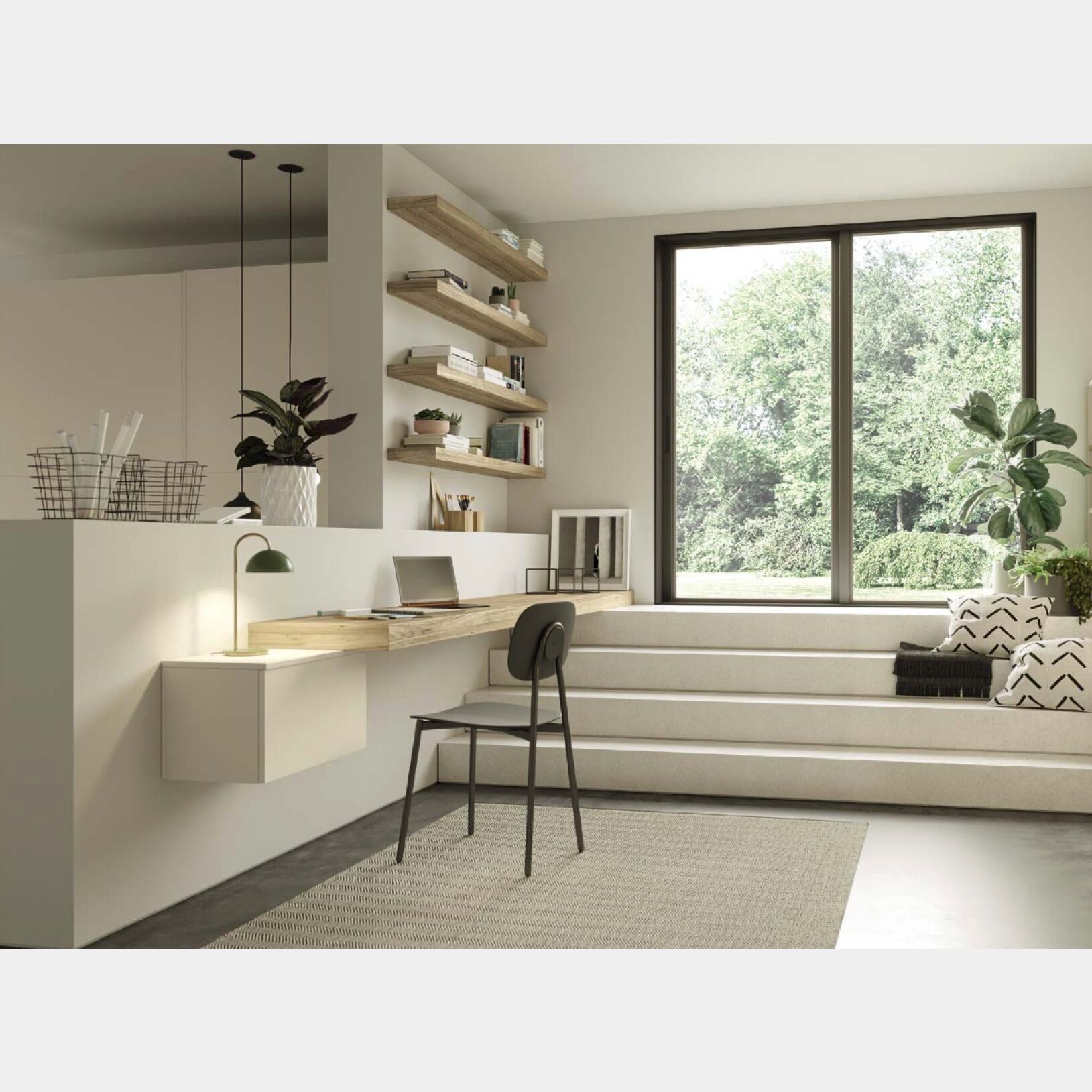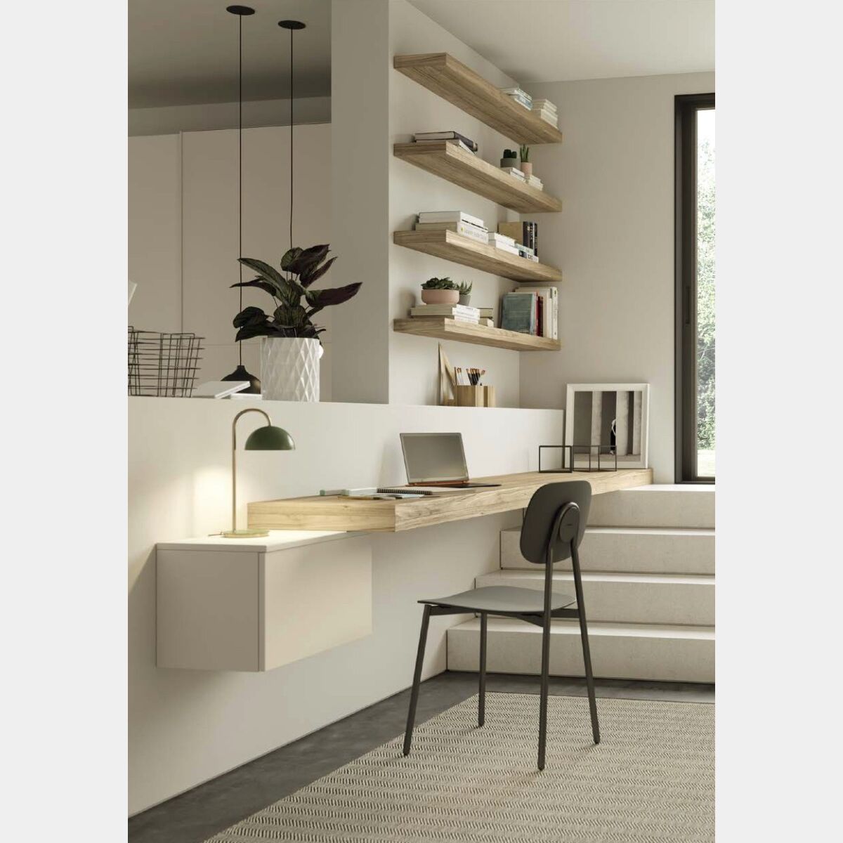 Per completare la zona studio è possibile richiedere inoltre le mensole sospese L.150, personalizzabili nelle finiture.