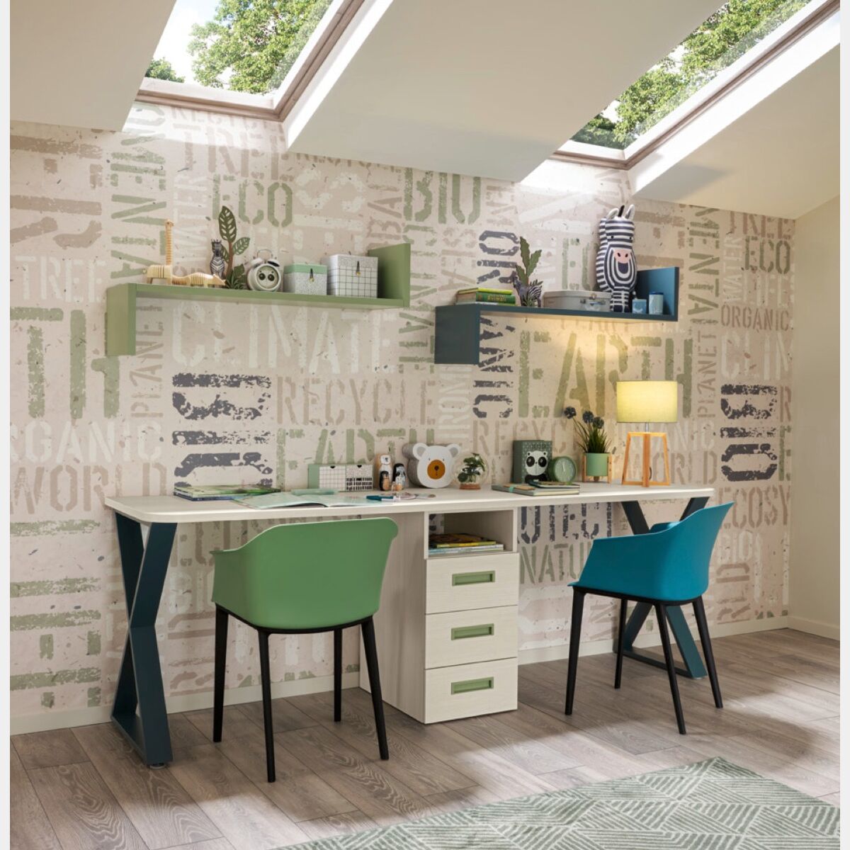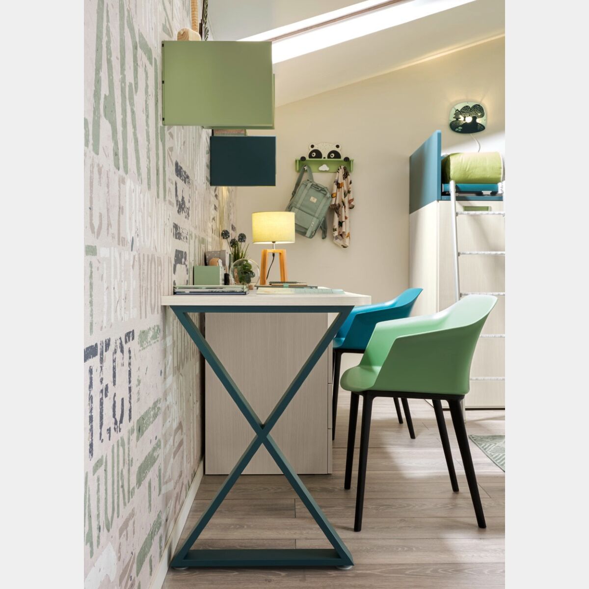 Le finiture proposte sono in Pavone per le gambe e Betulla per il piano. Abbiamo a disposizione un'ampia ganma di colori (laccati o nobilitati) per assicurare una perfetta soluzione ad ogni cameretta.