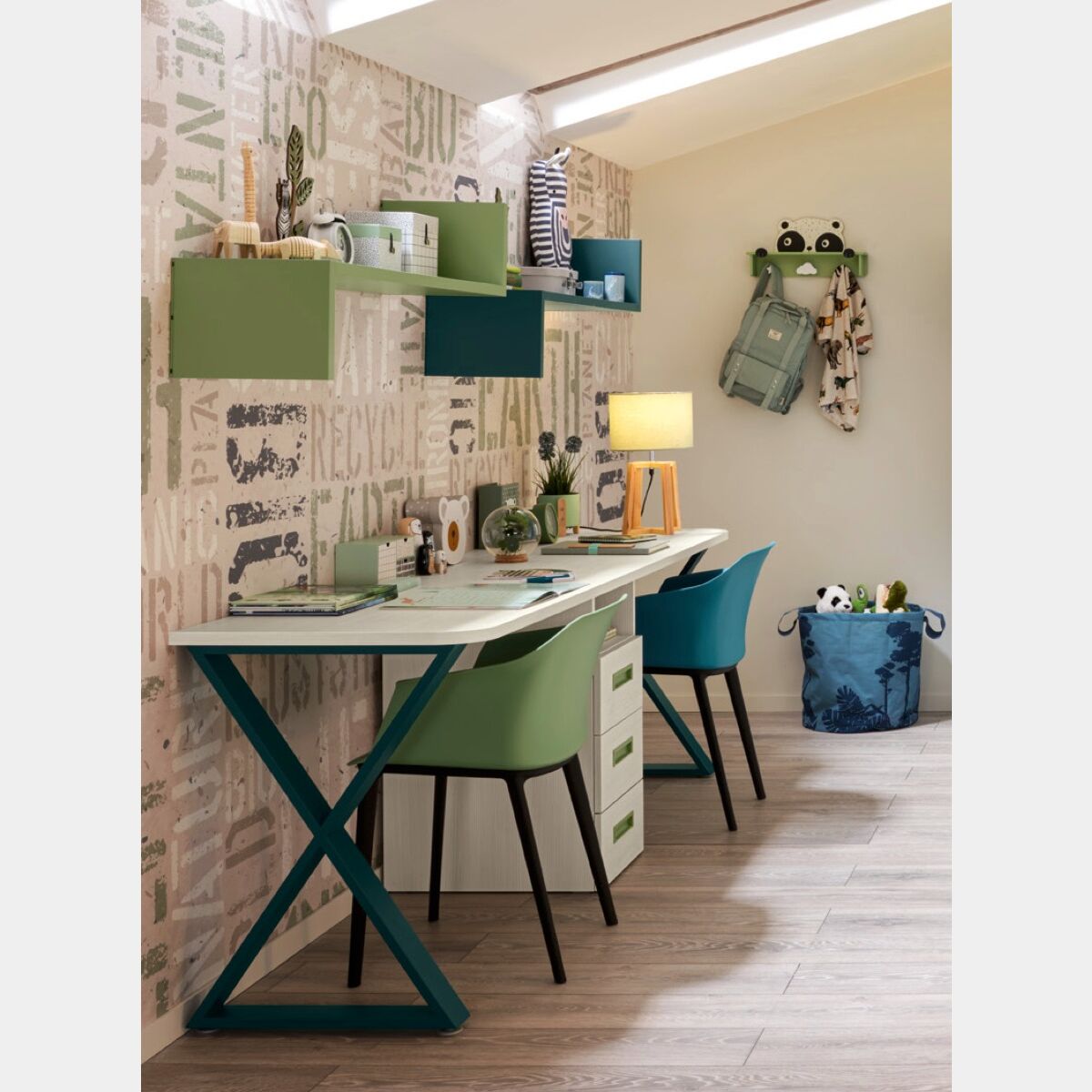 La zona studio è composta da due scrivanie appoggiate lateralmente a particolari supporti "X" e sostenute al centro dalla cassettiera con tre cassetti e vano passante.