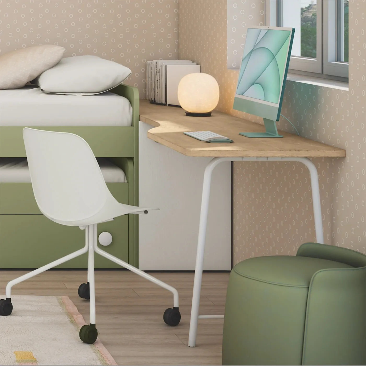 Fra gli optional offerti da questo articolo c'è la possibilità di acquistare una serie di vari pensili sospesi, acquistabili anche singolarmente. La personalizzazione si applica anche alle maniglie del carrello della scrivania, che qui sono di color Oliva.