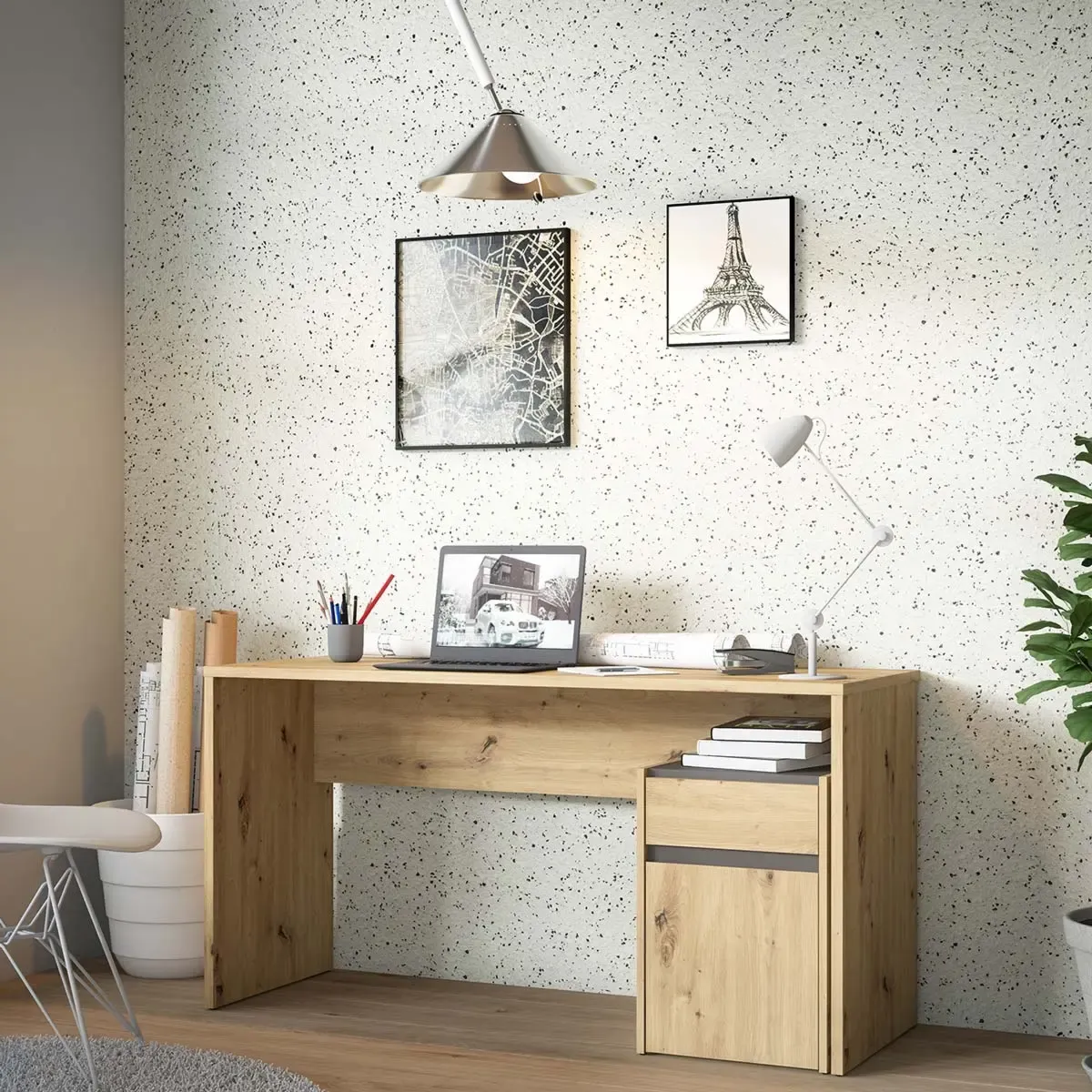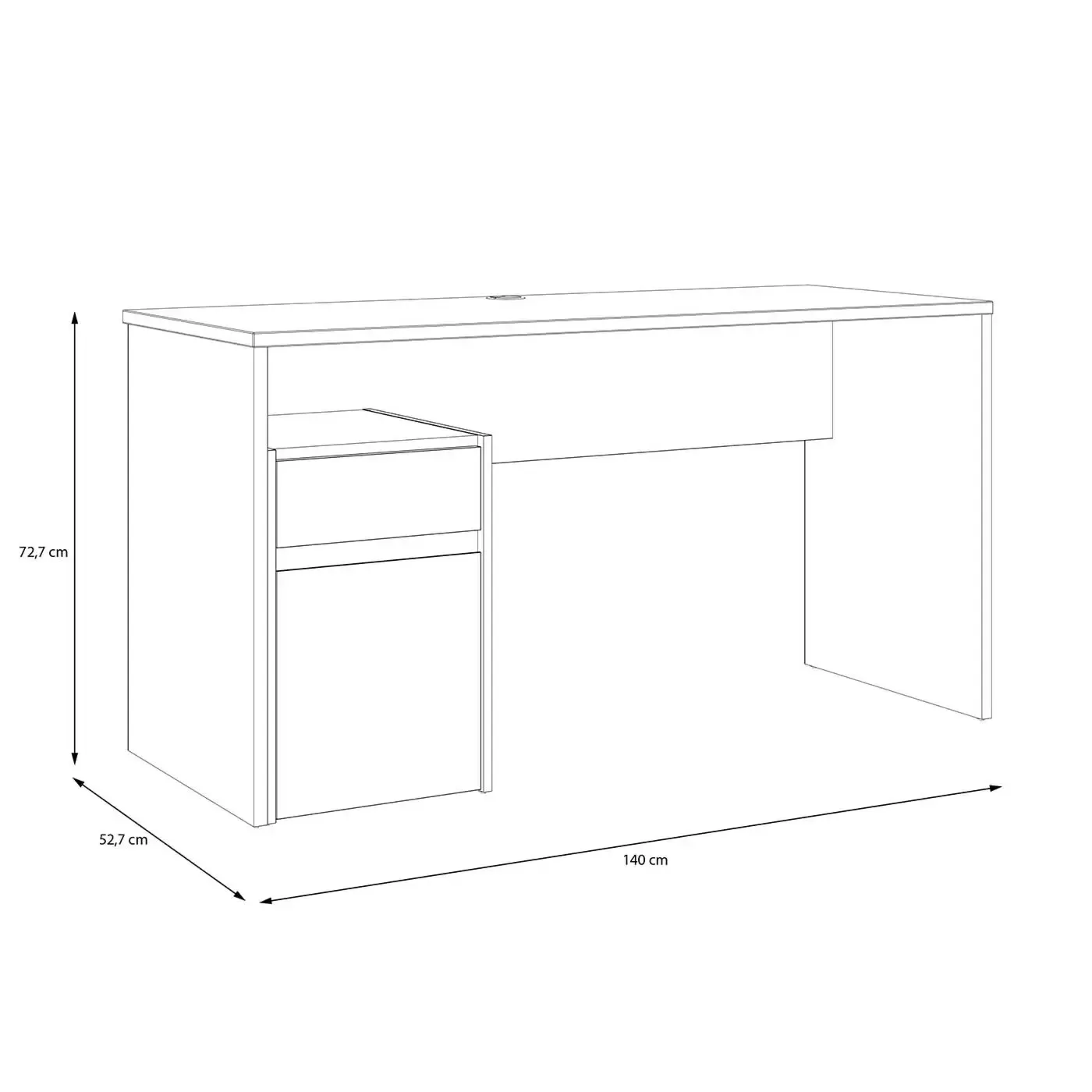 Scrivania con linee semplici, dotata di un modulo cassettiera, un cassetto e un anta, in promozione. Perfetta per uffici e camerette.