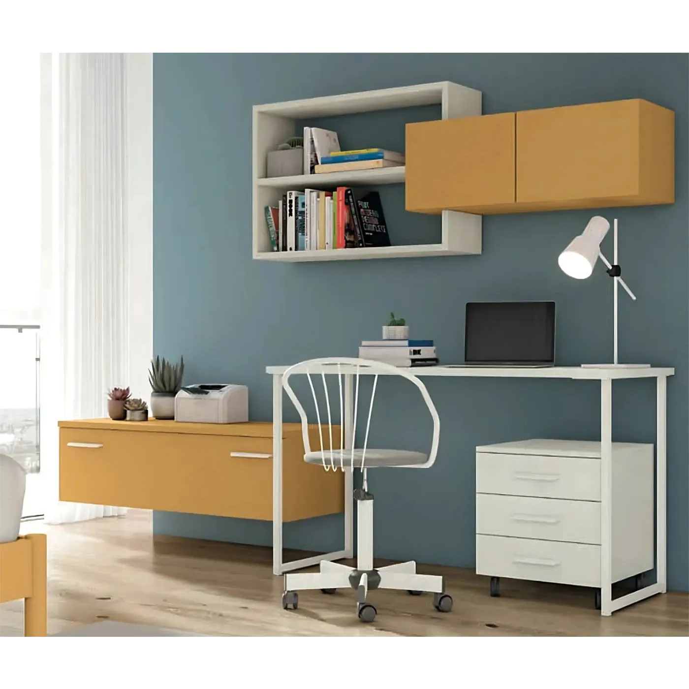 E' inoltre possibile completare la composizone richiedendo la pratica cassettiera a 3 cassetti con rotelline e i pensili sospesi, personalizzando anche in questo caso le finiture.