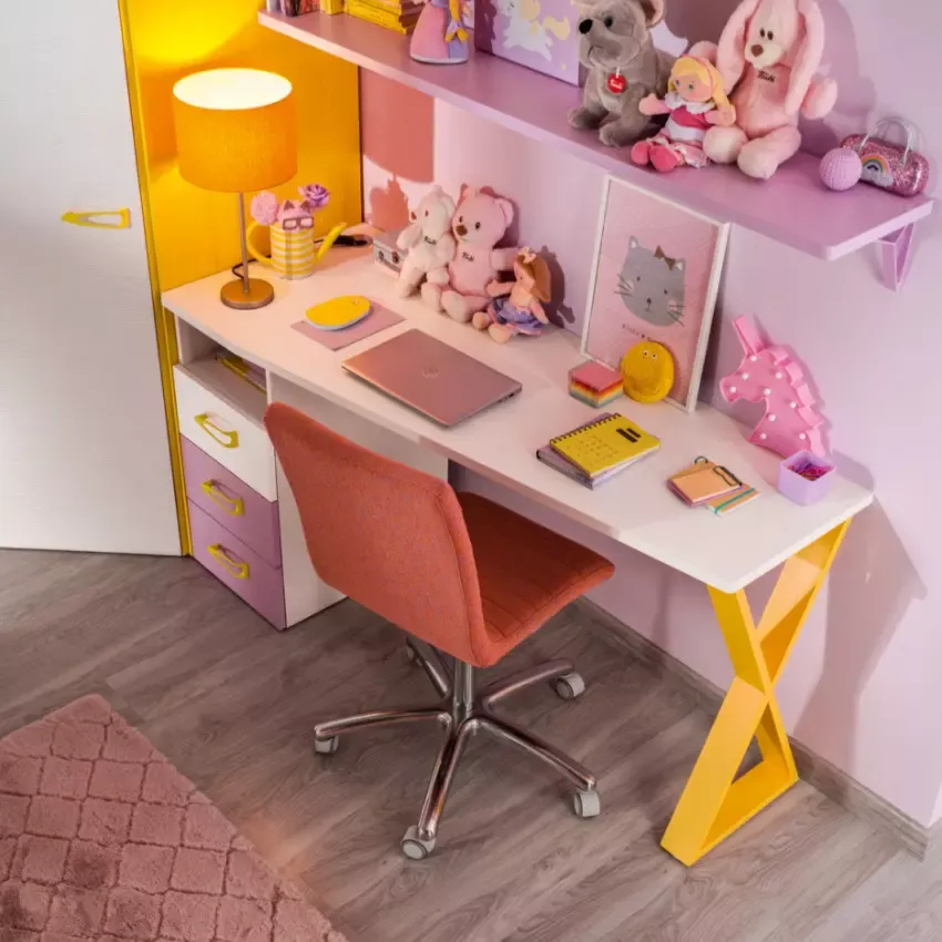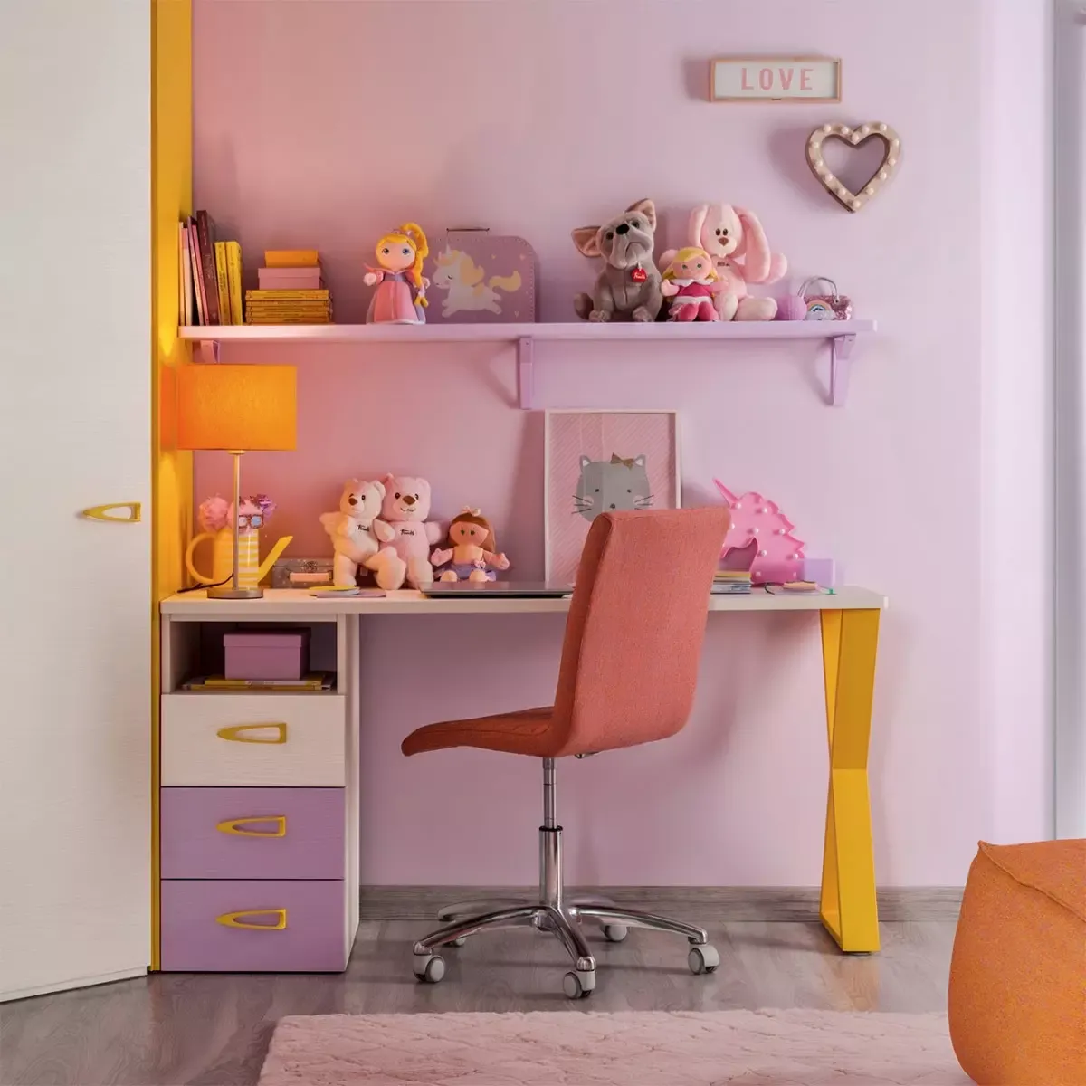Le finiture proposte Quarzo, Lilla e Giallo sole possono essere sostituite per creare una scrivania unica e originale, che rispecchi perfettamente i propri gusti.