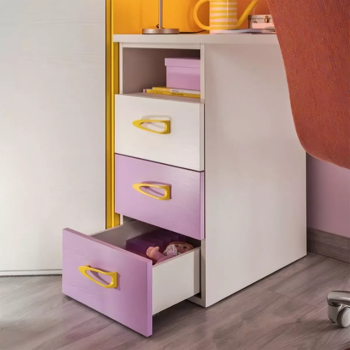 I tre cassetti servono a custodire piccoli oggetti come penne, matite, quaderni mentre il vano passante può essere utilizzato per il posizionamento di scatole o libri.