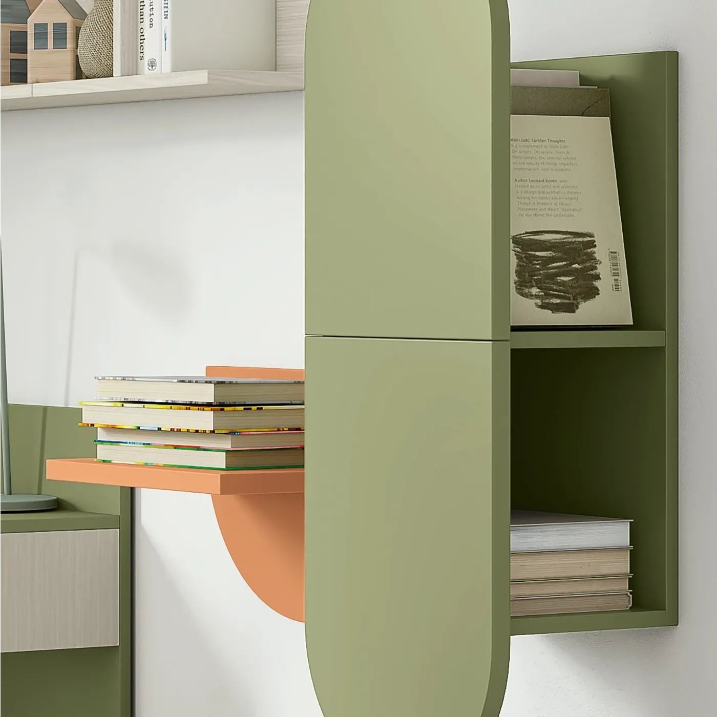 L'articolo è infine corredabile, se lo si vuole, con una zona studio sospesa composta da un vano ad incastro con un ripiano, da una ribalta con apertura a vasistas, da un ripiano sospeso con pannello, una serie di pensili sospesi e da un pensile con anta decorativa frontale.