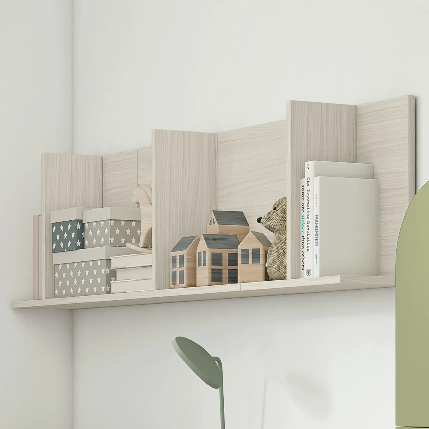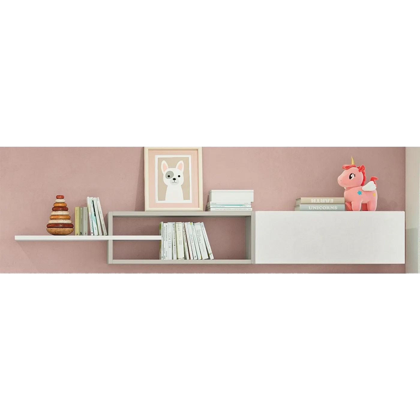 Scrivania sospesa per ragazzi che si compone di un pannello fissabile a muro su cui a sua volta fissare la scrivania. Presenta 2 cassetti e un vano a giorno e offre un pratico piano di lavoro.