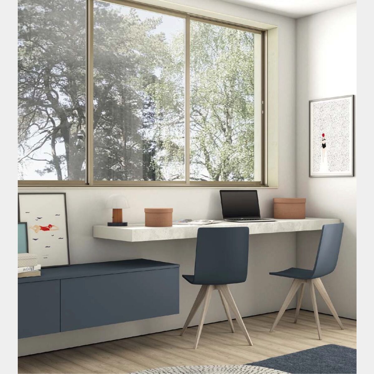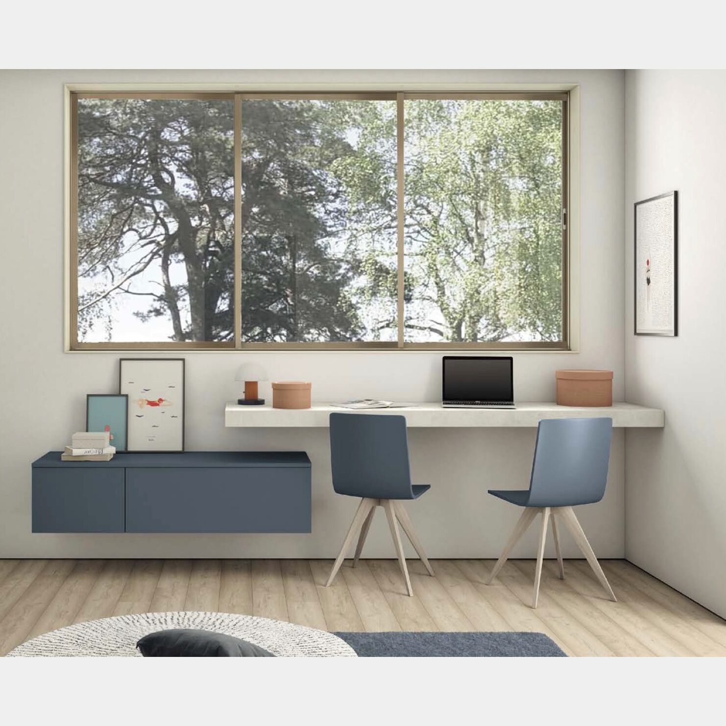 Scrivania sospesa con pensile, finitura Malta e Blu opale