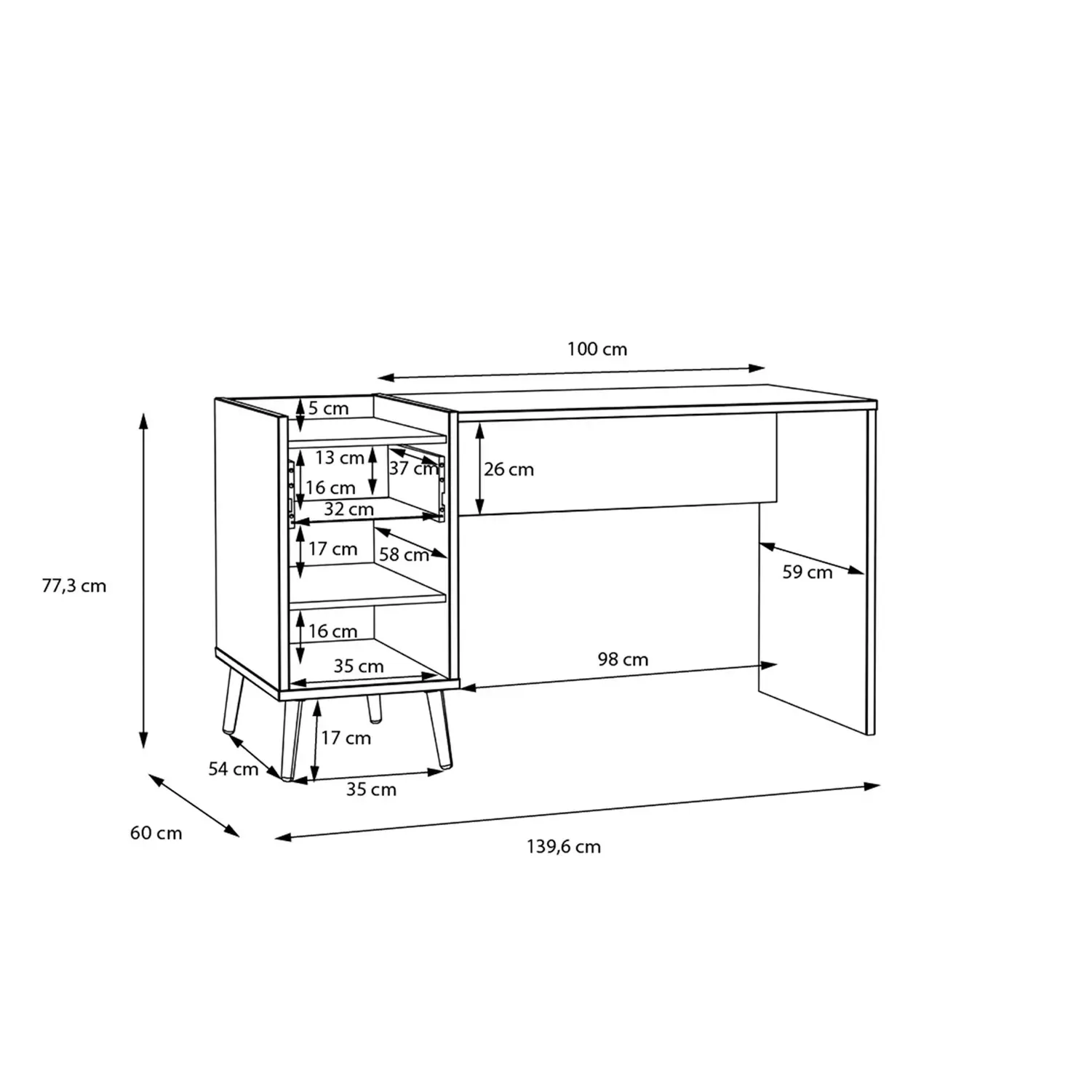 La scrivania è caratterizzata da un cassetto, un'anta con ripiano centrale e un ampio piano di lavoro.