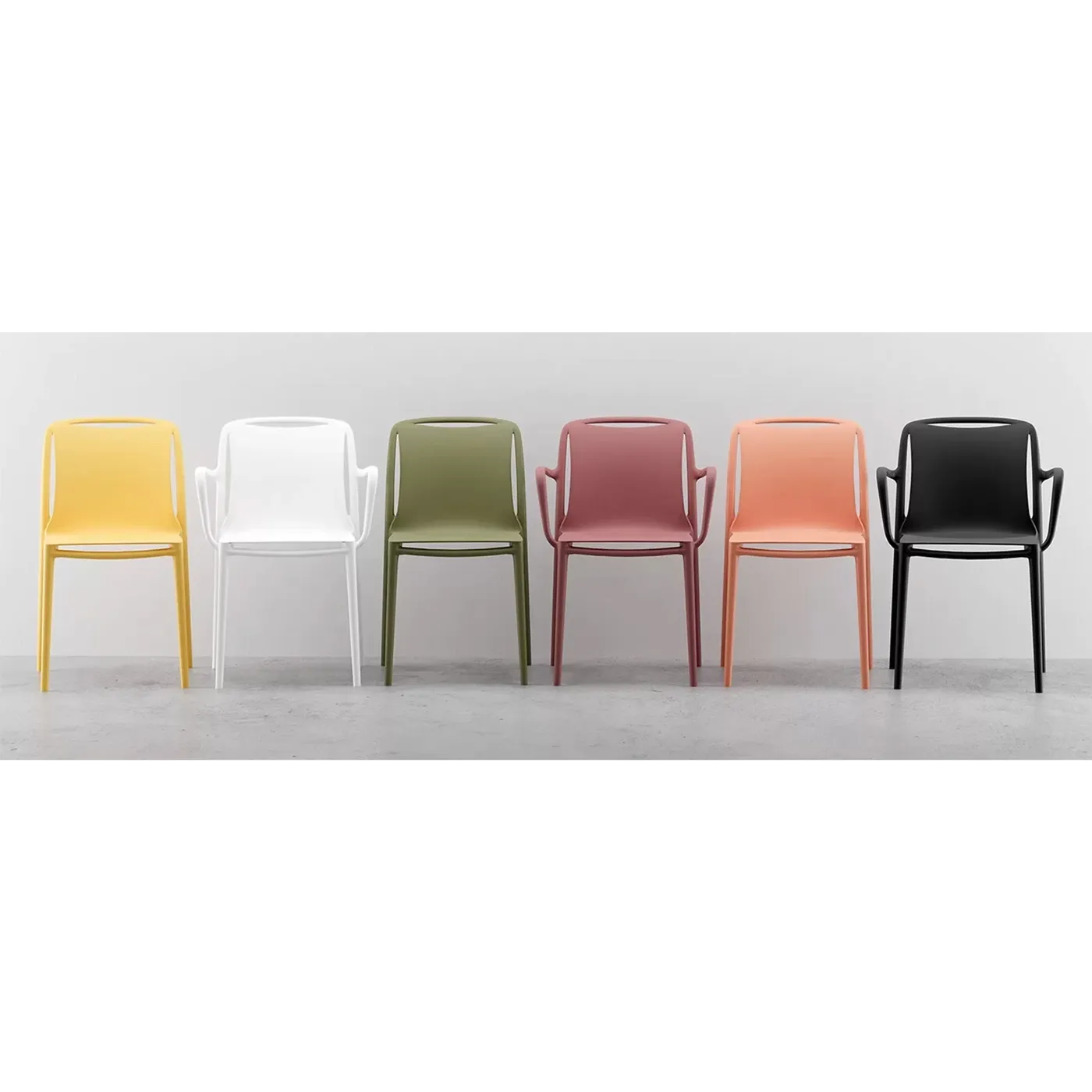 La sedia è poi facilemente impilabile al momento di spostarla o conservarla. Il materiale con cui sono state fabbricate è completamente riciclato, unito a fibre di vetro.