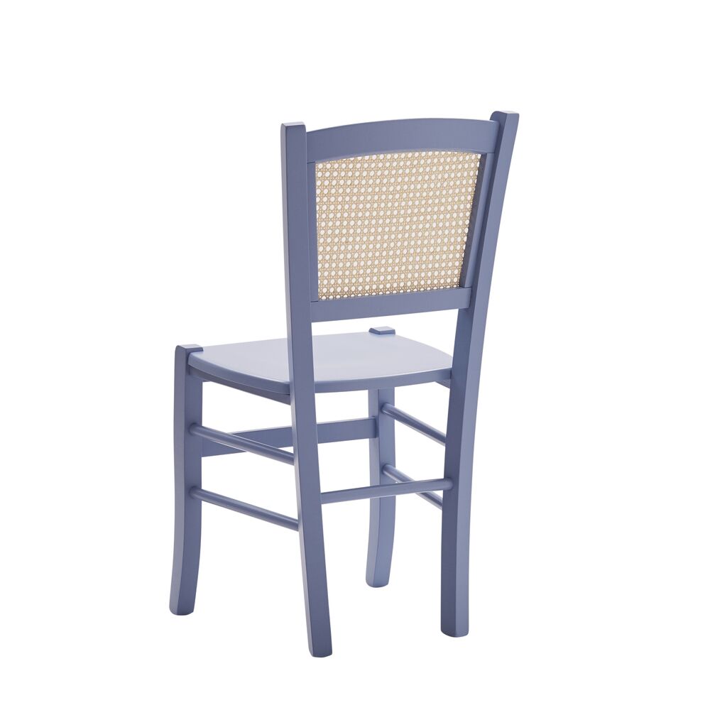 La sedia presenta un fondino legno e lo schienale in paglia di Vienna, la finitura è in Blu Copenaghen laccato, l'altezza della seduta misura 47 cm.