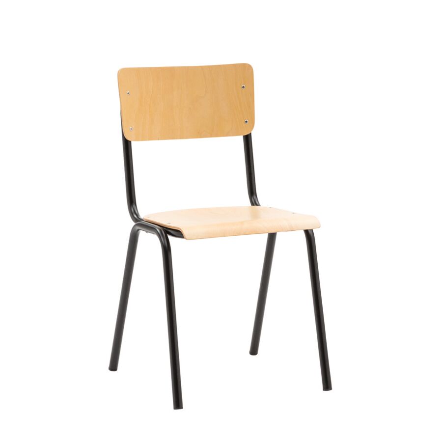 Le sedie per la scuola sono colore tinta naturale con fusto in metallo nero.
