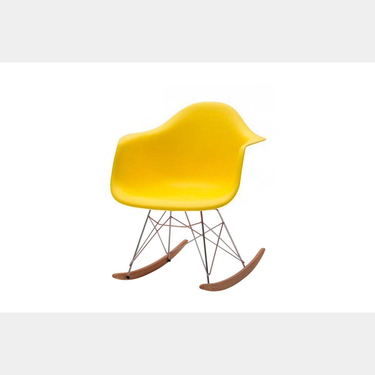 Sedia Moderna e di Design colore Giallo a dondolo. Seduta ergonomica in pvc, con tiranti in metallo, e dondoli in legno. Questa sedia, unisce l'eleganza del design e il fascino moderno offrendo così un risultato estremamente chic e rendendo la vostra zona living di tendenza.