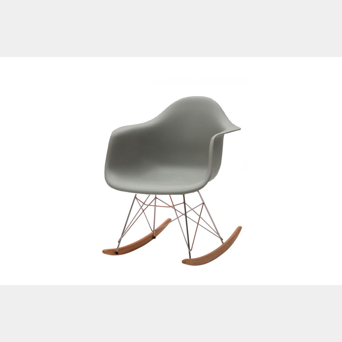 Sedia Moderna e di Design colore Grigio a dondolo. Seduta ergonomica in pvc, con tiranti in metallo, e dondoli in legno. Questa sedia, unisce l'eleganza del design e il fascino moderno offrendo così un risultato estremamente chic e rendendo la vostra zona living di tendenza.