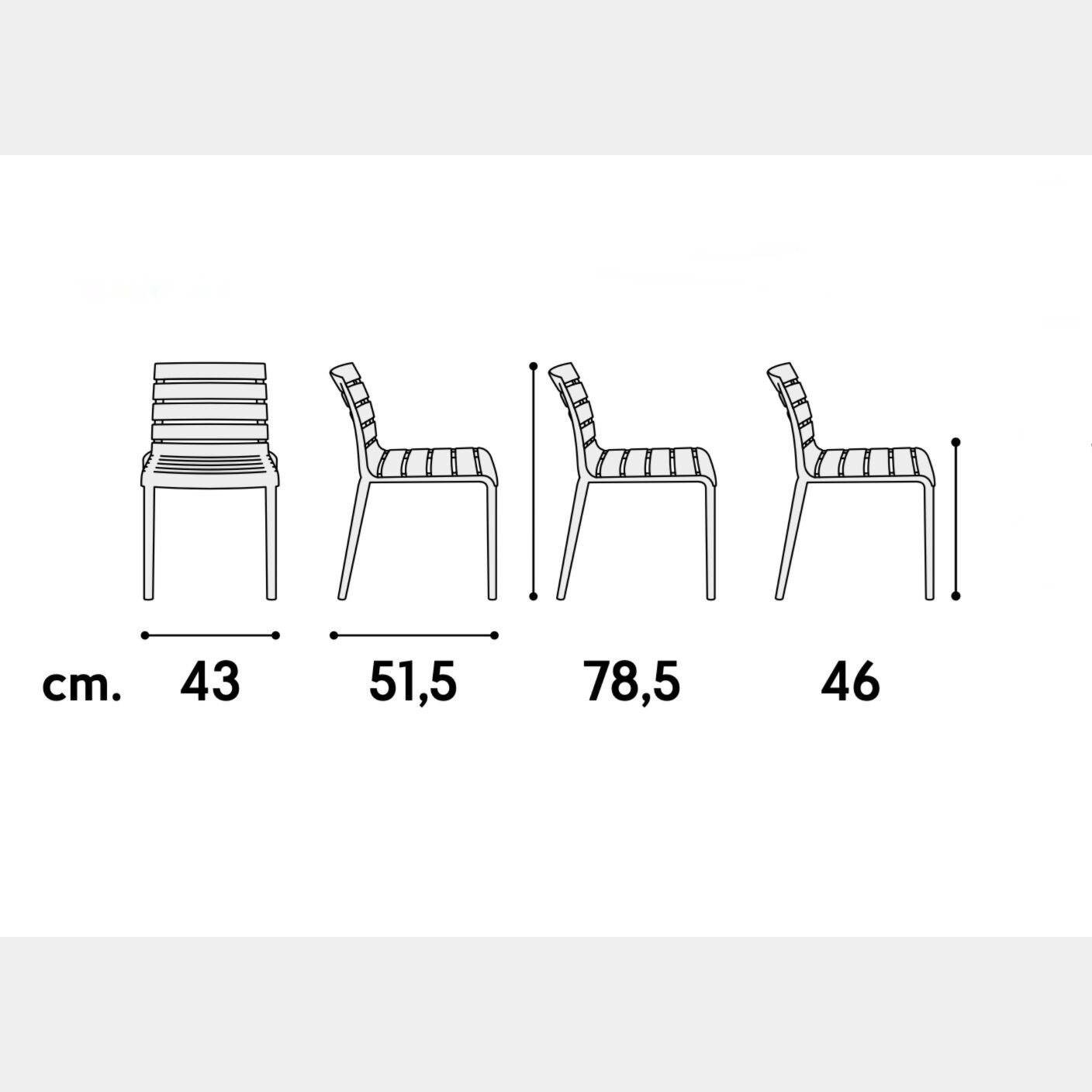 E' una sedia moderna realizzata in resistente polipropilene e progettata per impilarsi comodamente sia negli spazi interni che esterni.