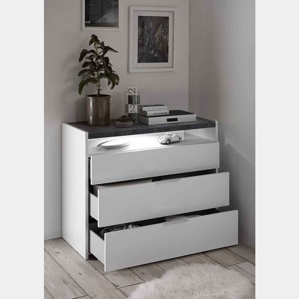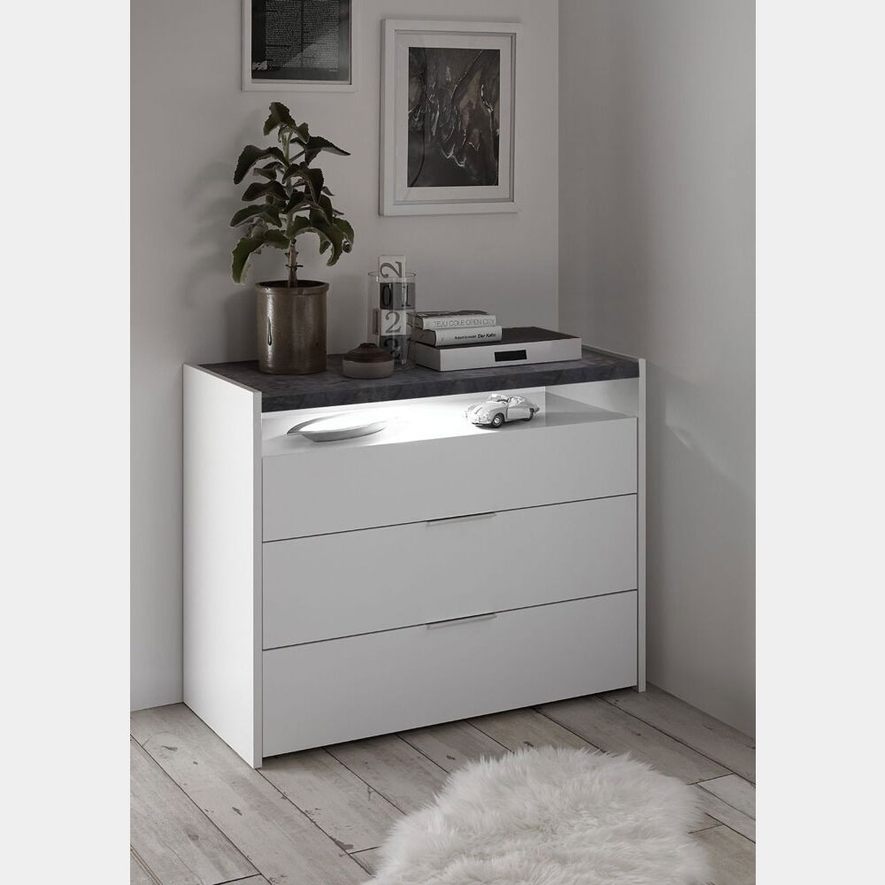 Comò 3 cassetti con vano a giorno con piano Ossido e finitura scocca bianco opaco. Il comò della Collezione Mondo si presenta nella finitura bianco opaco con il top del ripiano in finitura Ossido. Tra i 3 cassetti e il ripiano beton c'è un lungo vano a giorno in cui poter riporre i propri oggetti. A tale vano è possibile aggiungere come OPTIONAL un Led Bianco creando un mondo di effetti di luce. Il comò ha delle maniglie in metallo e la struttura e cassetti hanno uno spessore di 22mm. La convenienza non finisce qui, il comò oltre alla solida struttura ha anche le guide dei cassetti ammortizzate.