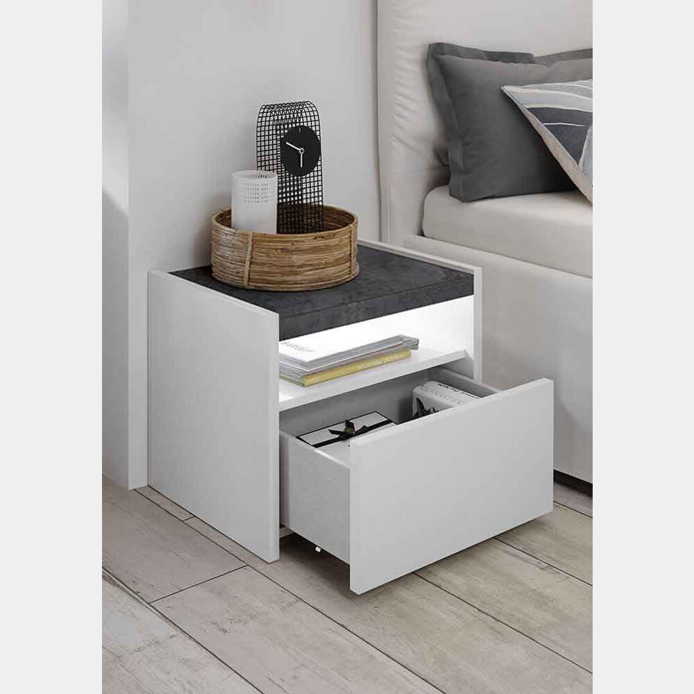Comodini ad un cassetto con vano a giorno con piano Ossido e finitura scocca bianco opaco. Il comodino della Collezione Mondo si presenta nella finitura bianco opaco con il top del ripiano in finitura Ossido. Tra il cassetto e il ripiano Ossido c'è un piccolo vano a giorno in cui poter riporre i propri oggetti. Il comodino ha la struttura e cassetto con uno spessore di 22mm. La convenienza non finisce qui, il comodino oltre alla solida struttura ha anche il cassetto con le guide ammortizzate. Ai comodini è possibile aggiungere la luce LED creando un mondo di effetti.