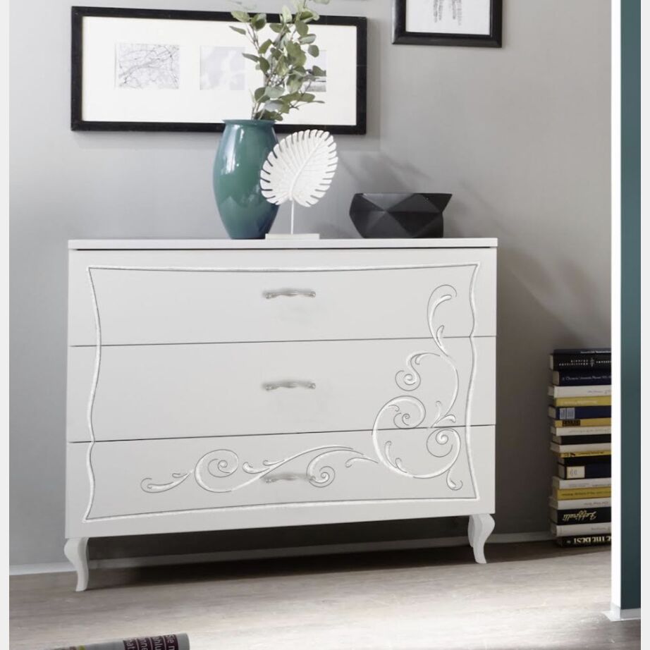 Set Comò e 2 comodini, finitura Bianco opaco con serigrafia, Made in Italy