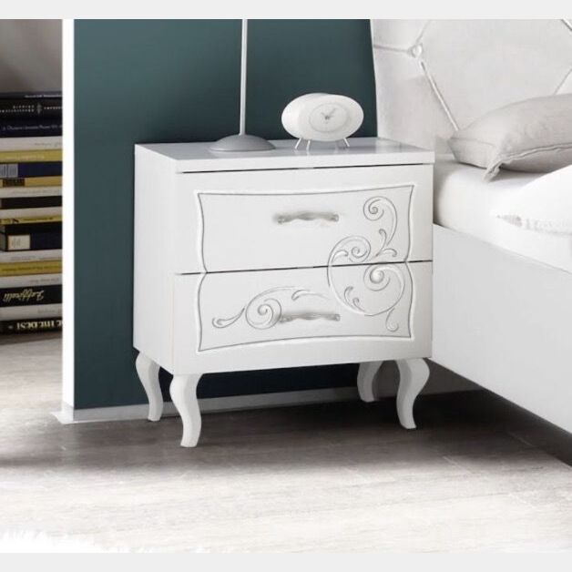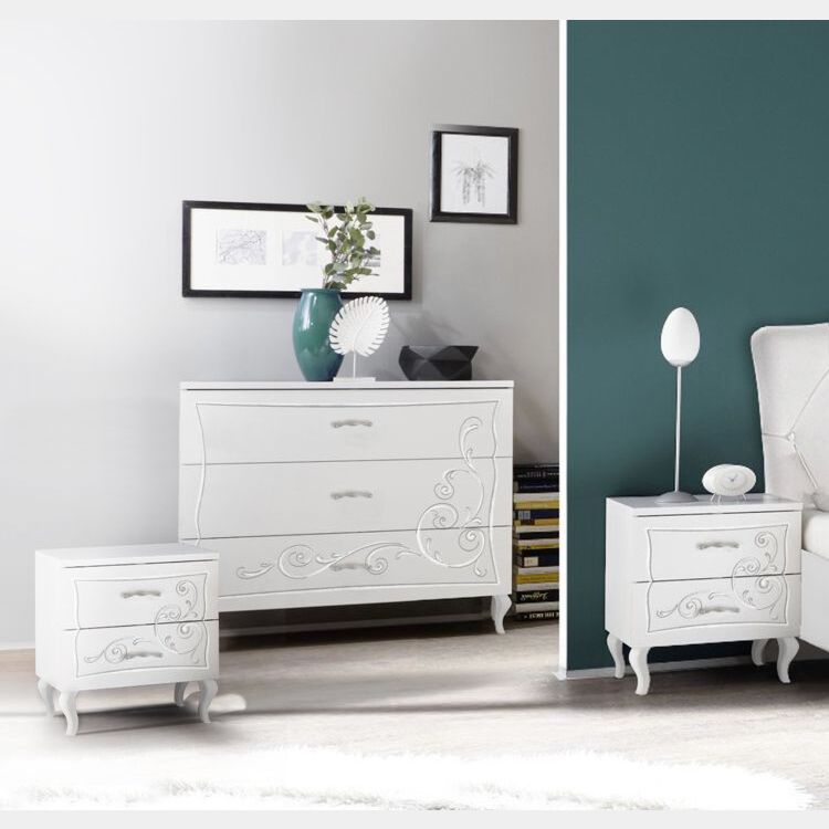 La bellissima serigrafia e i particolari piedini rendono la composizione per la zona notte elegante e dallo stile contemporaneo, perfettamente adattabile ad una camera da letto tradizionale, ma anche moderna. Inoltre il colore bianco opaco fa si che il set si adatti e sia abbinabile a diversi tipi di arredi e di camere da letto.