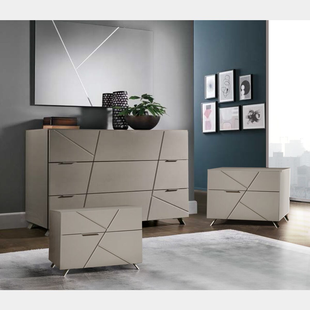 Il set composto da comò e due comodini presenta un design moderno e accattivante. Dettagli ricercati conferiscono al trittico uno stile unico e caratteristico, capace di arredare con gran classe ogni camera da letto.