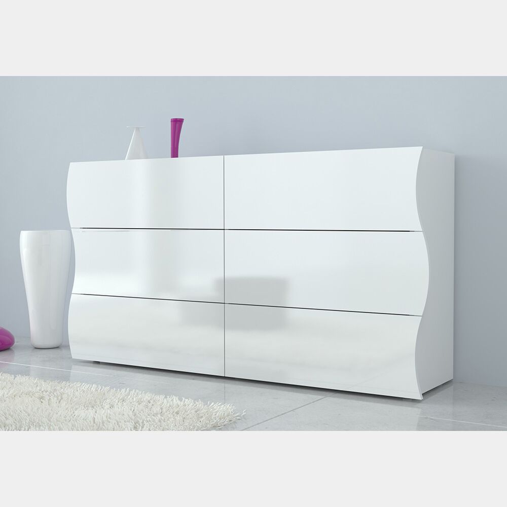 Madia / comò di design, moderno e funzionale adatto sia in soggiorno che in camera da letto. Questa sua doppia funzione è possibile grazie al grande spazio al suo interno, infatti la madia è composta da 6 cassetti sagomati, tutto nella finitura bianco laccato lucido.