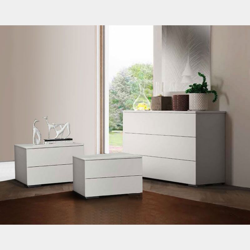 I 2 comodini come in foto sono disponibili in finitura Bianco Nobilitato. I 2 cassetti hanno un'apertura a presa laterale, una scelta pensata ai fini dell'estetica.