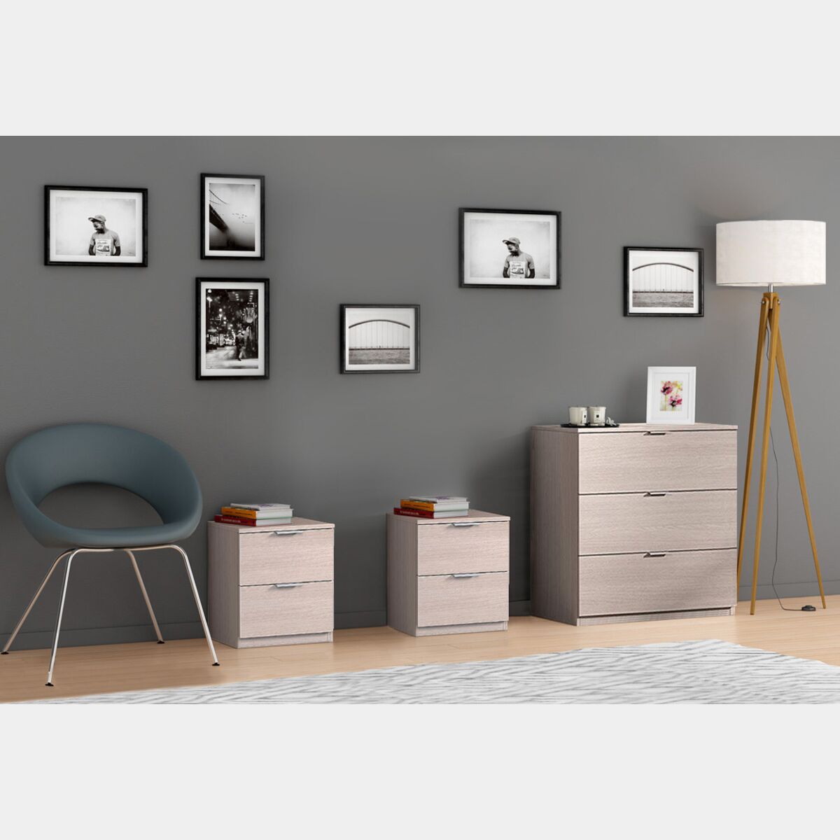 Set Composto da 2 Comodini e 1 Comò- Comodino 2 cassetti, rovere chiaro.Il prodotto è un comodino di design moderno e funzionale adatto a qualsiasi tipo di camere, visto il colore neutro.