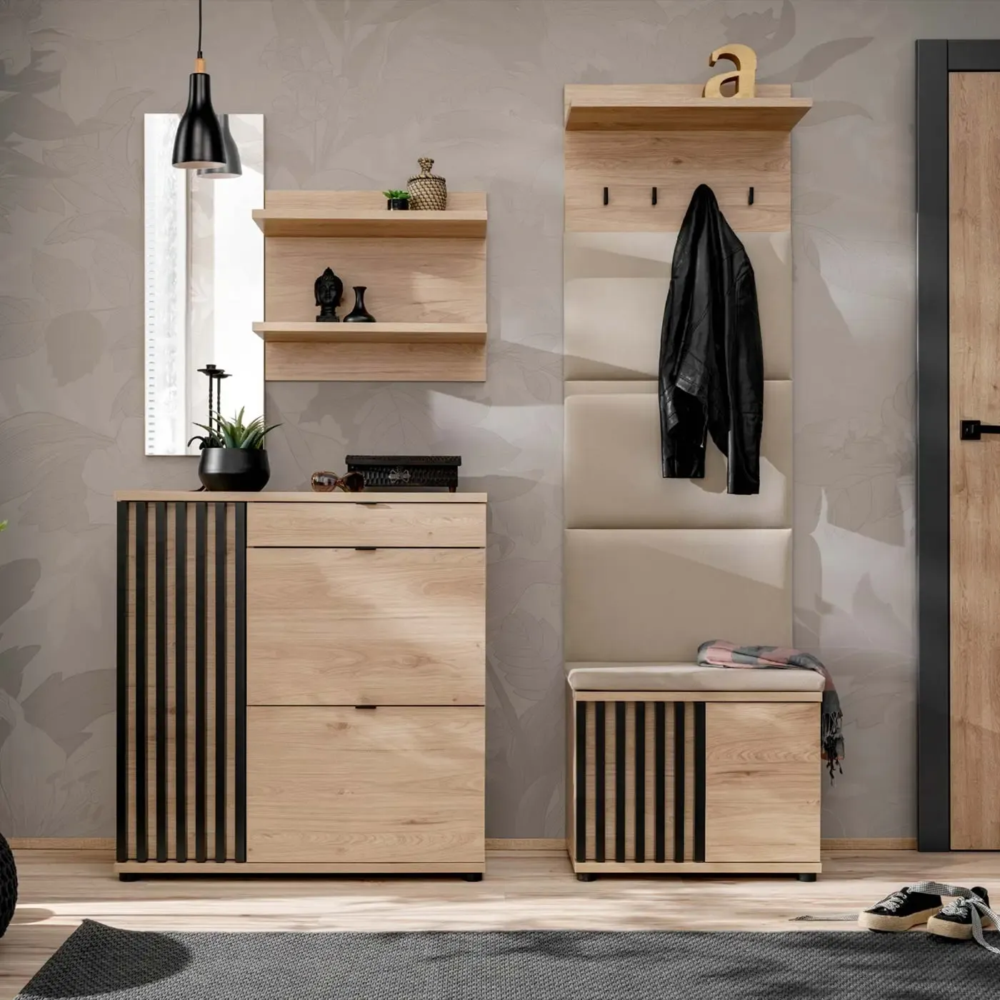 Set da ingresso di 5 pezzi che comprende un pannello appendiabiti con ripiano e cuscini, una scarpiera bassa, una scarpiera a un'anta e 2 cassetti, un pannello con 2 ripiani e una specchiera.