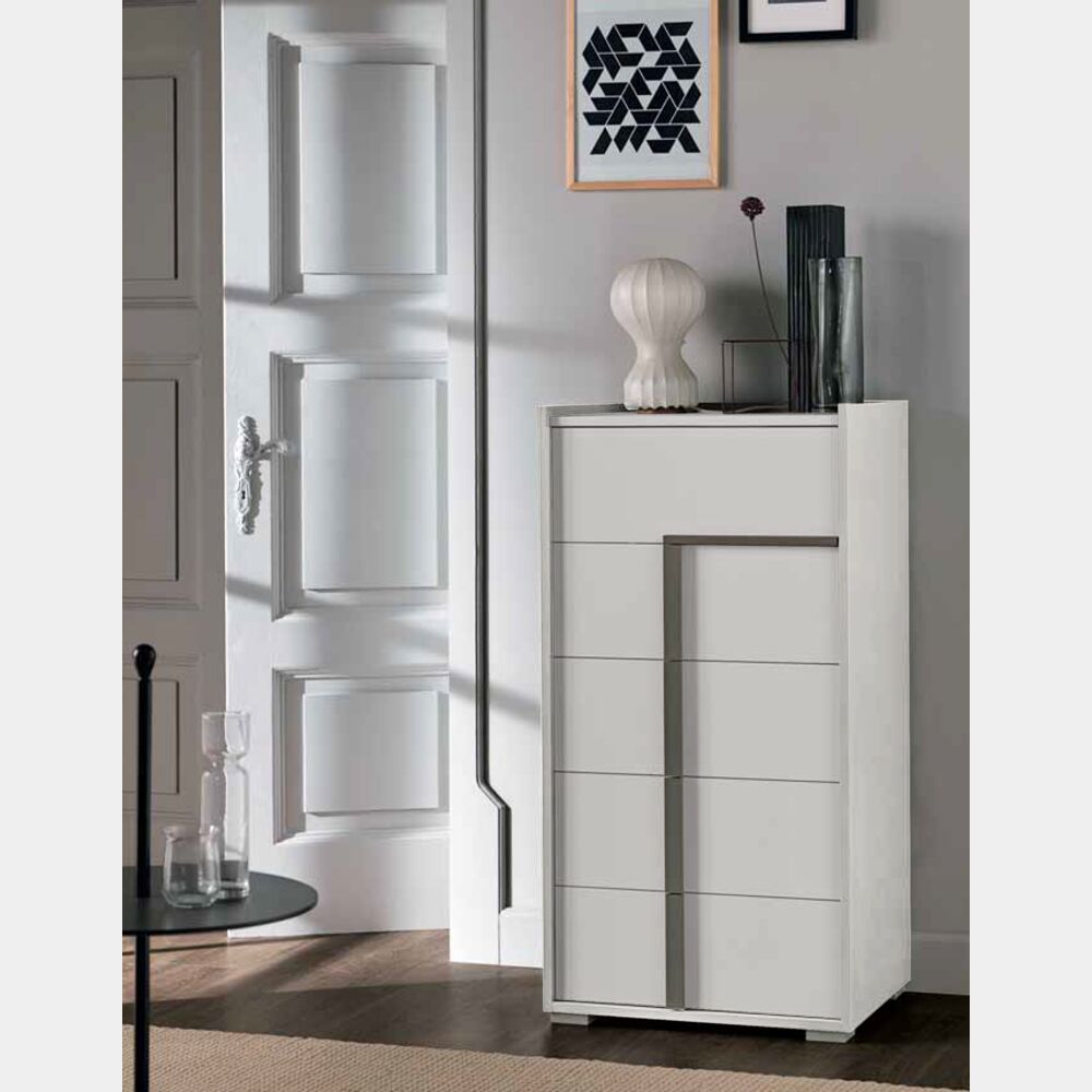 - Il settimino è dotato di 5 cassetti forniti con chiusura ammortizzata e guide in metallo. Un'ottima soluzione da adattare ad uno spazio ristretto.