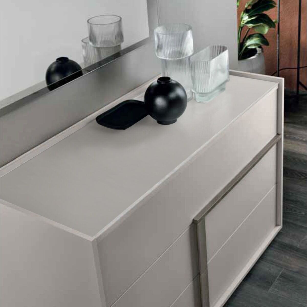- Il comò: caratterizzato dalla presenza di 3 ampi cassetti con guide in metallo ammortizzate viene garantito un ampio piano di appoggio, la finitura interna dei cassetti è trama tessuto.