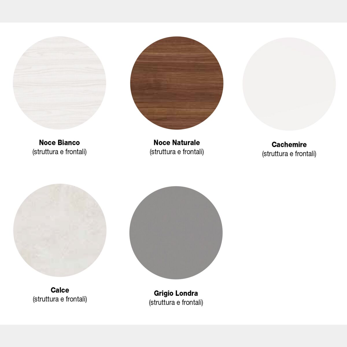 Finiture disponibili: Noce naturale, Noce bianco, Cachemire, Grigio londra.