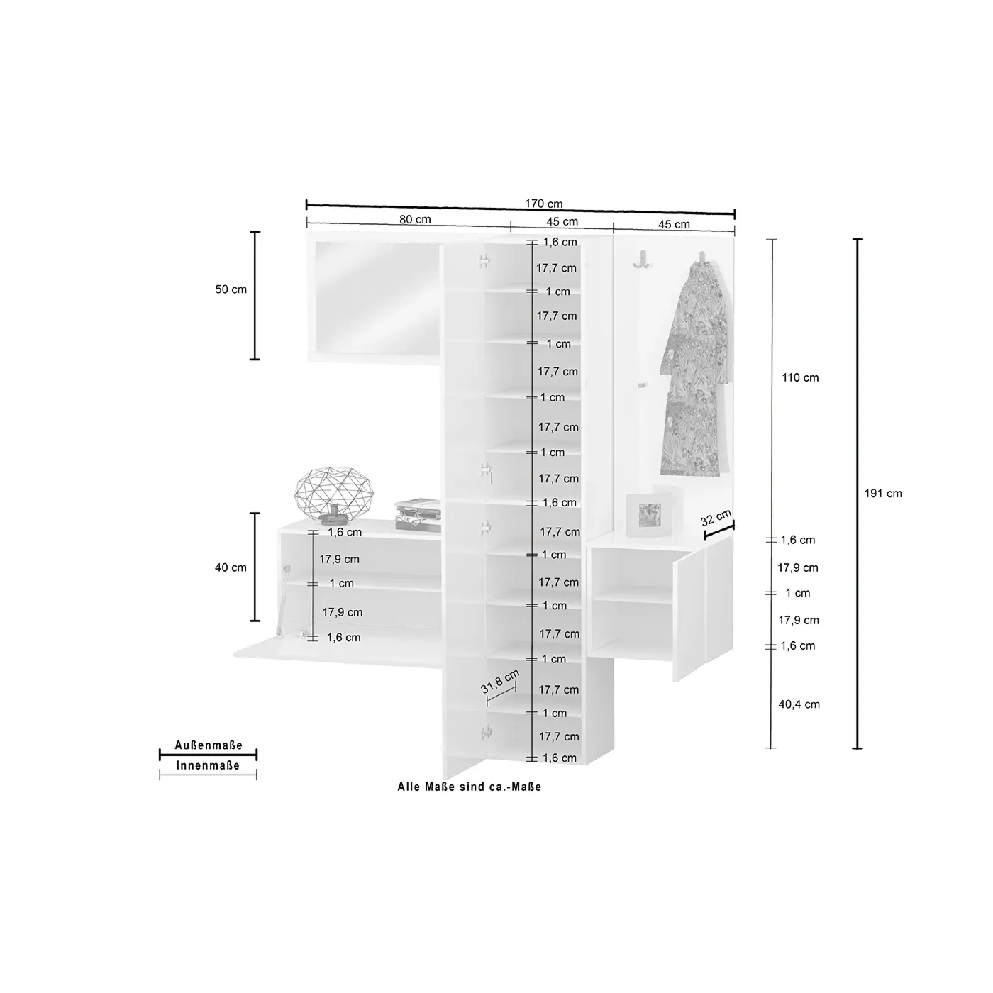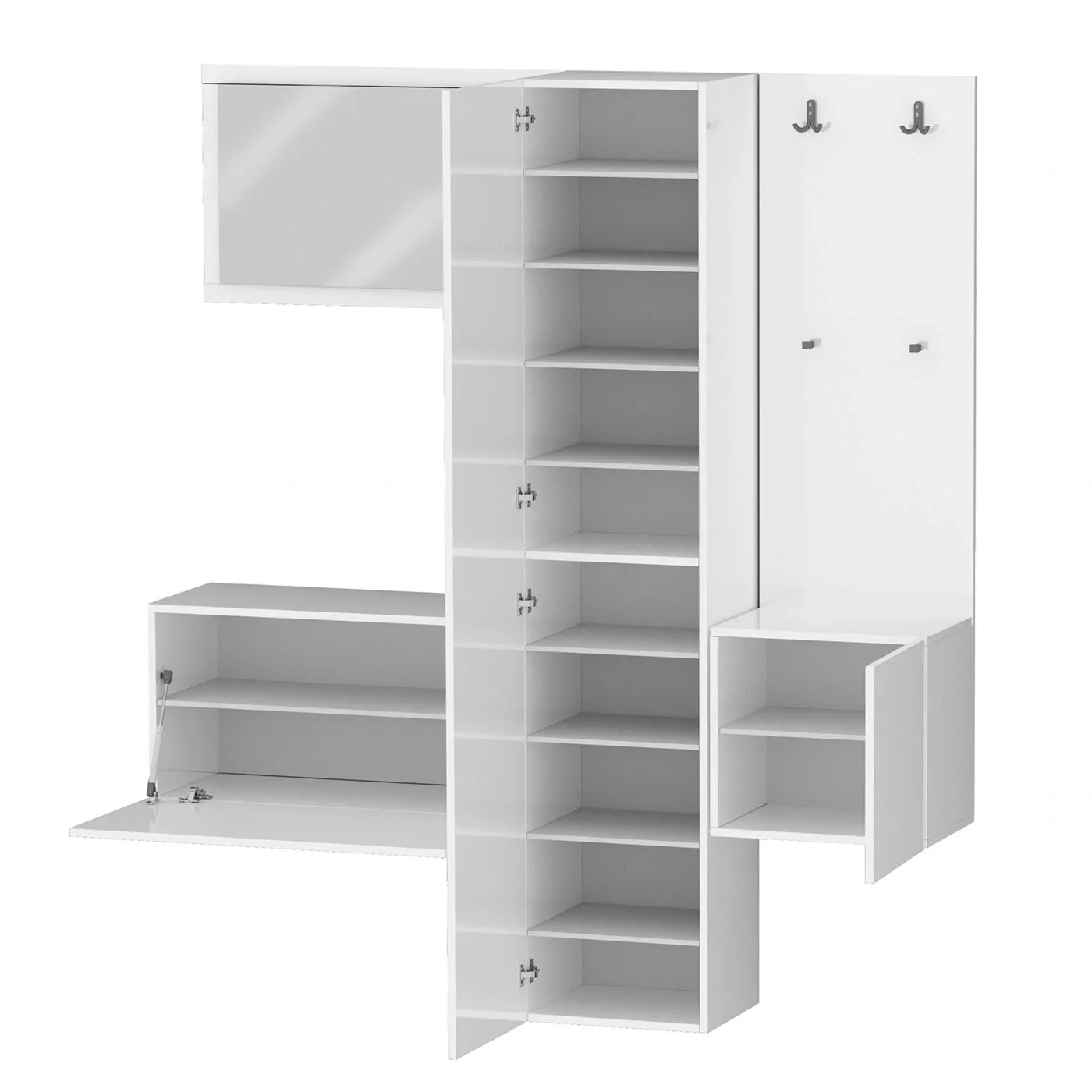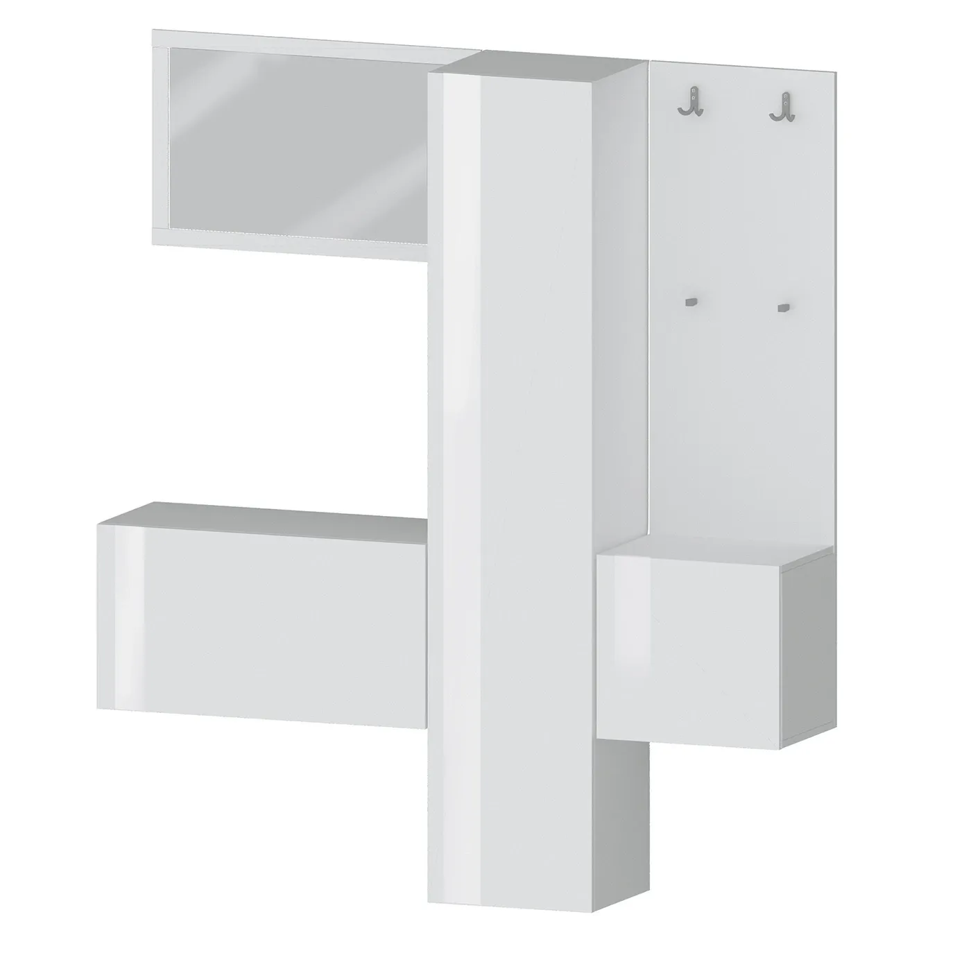 Dotato di un ampio spazio di stoccaggio con 11 ripiani interni e 2 ganci appendiabiti, il set include anche 1 comodo specchio. Le dimensioni compatte e la grande versatilità consentono a questo set di adattarsi facilmente a qualsiasi ambiente della casa. Oltre all'appendiabiti e alla specchiera grande, il set comprende un mobile contenitore con un'anta a ribalta, un elemento laterale con un'anta battente e un armadio scarpiera.