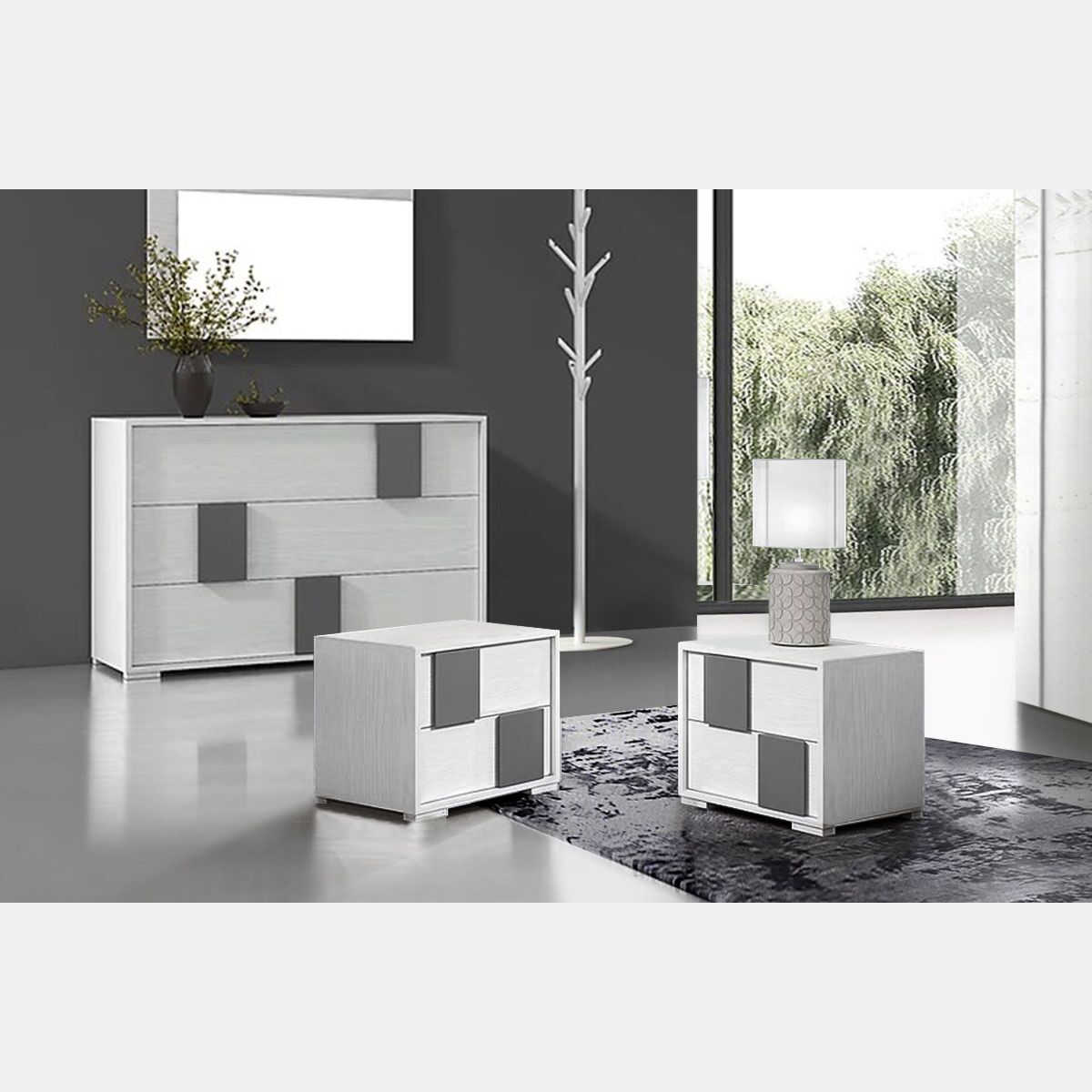Arreda la zona notte scegliendo l'esclusività e il design elegante e semplice dei comò e comodini Frassino gesso e Grigio scuro.