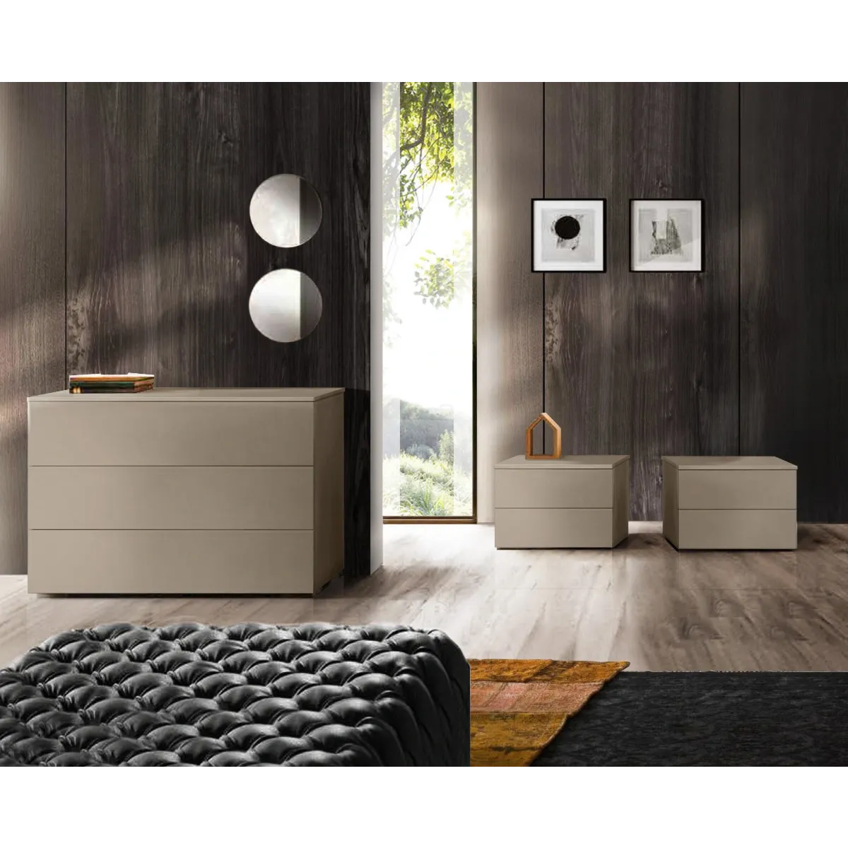 Composto da un comò e due comodini il set si caratterizza per l'assenza di maniglie a vista, creando continuità tra scocca e frontali.