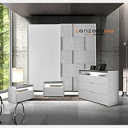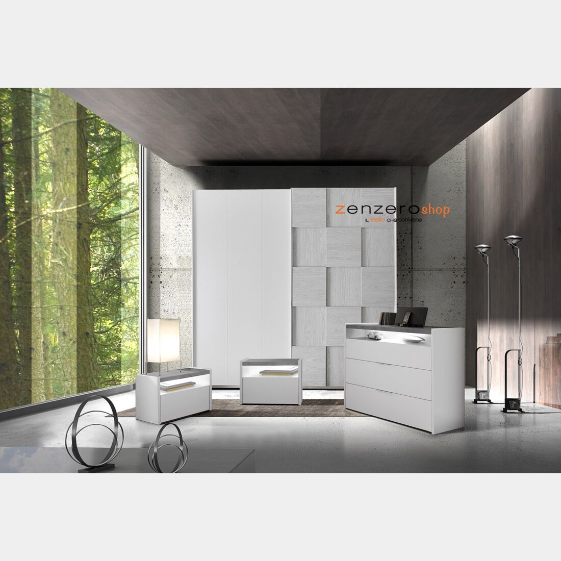 Set zona notte con Armadio scorrevole, Comò e Coppia Comodini, Bianco opaco, Artik e Beton