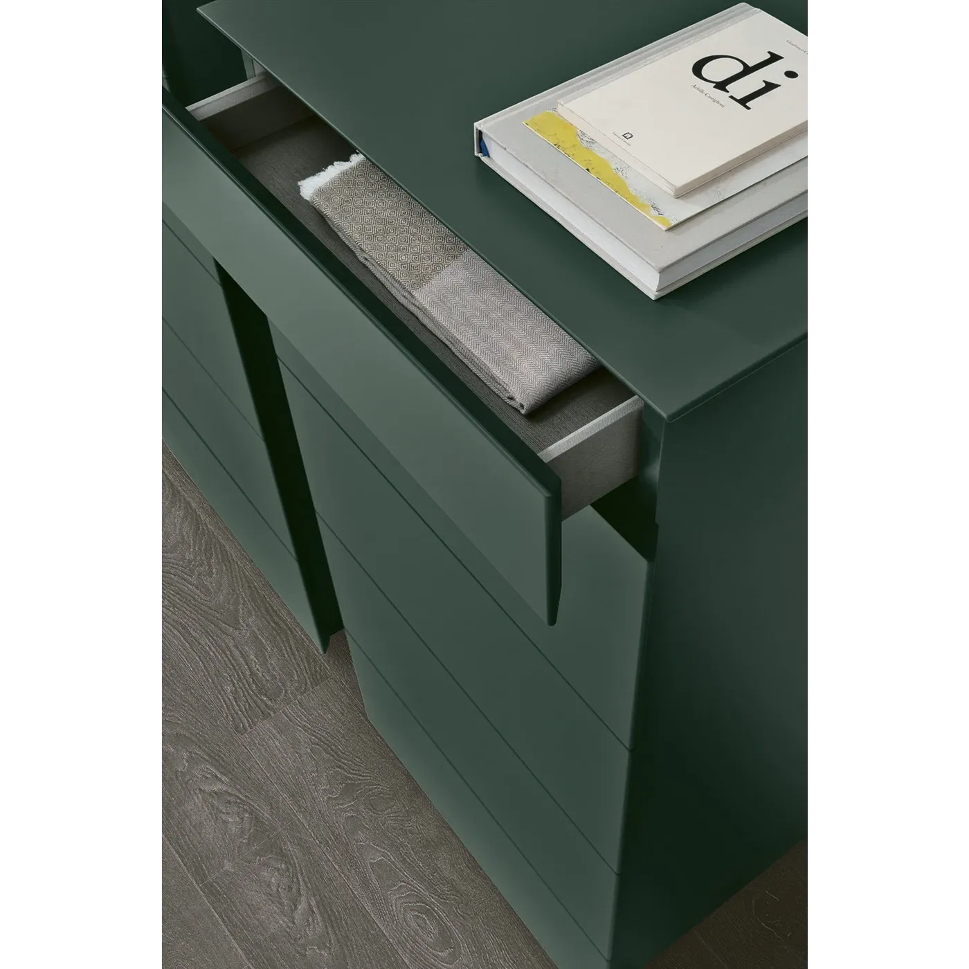 I cinque capienti cassetti si aprono tramite presa laterale, l'assenza di maniglie a vista contribuisce a rendere il settimino Pass elegante e moderno.