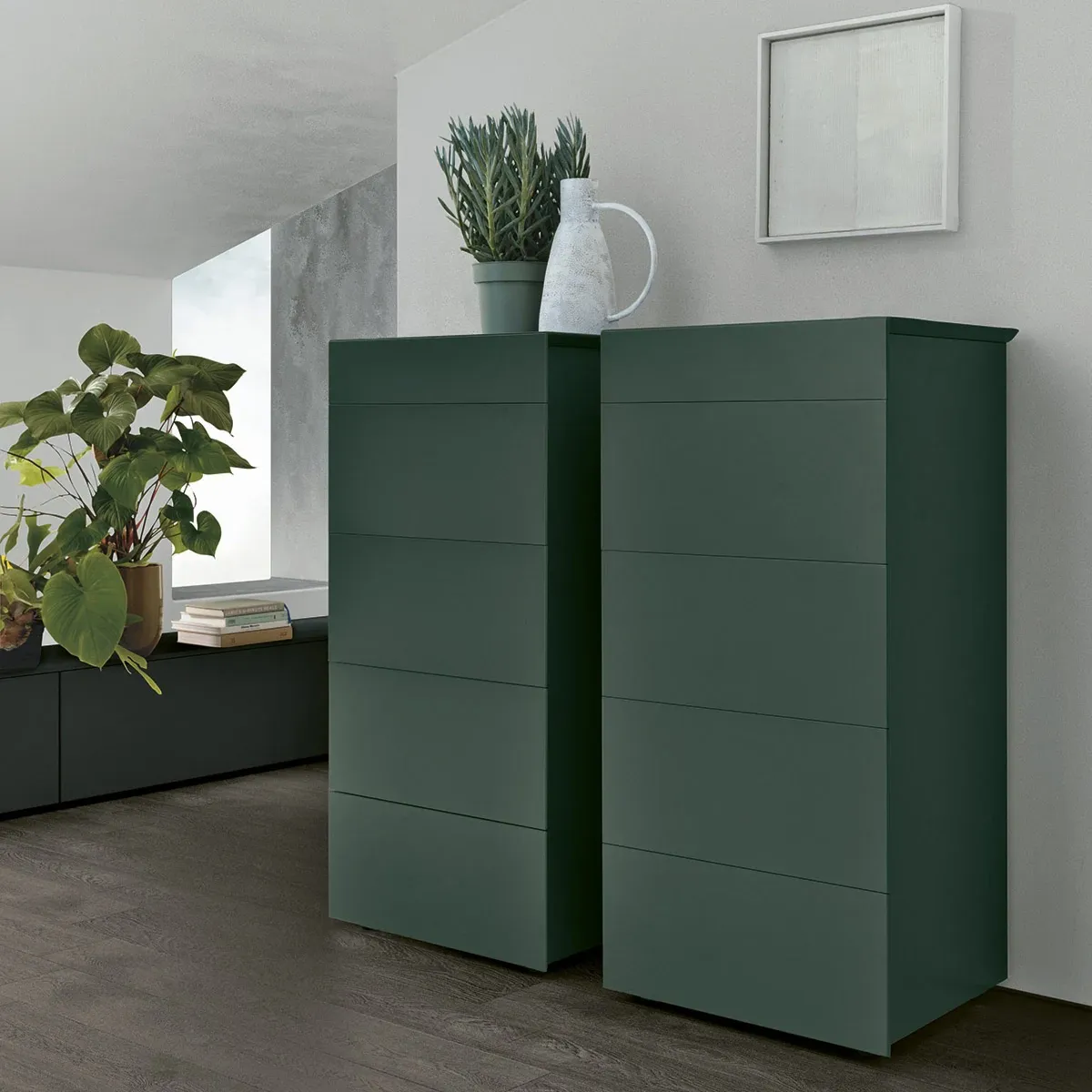 Il Settimanale Pass in laccato mirto 165 moltiplica il contenimento ma anche lo stile della camera: il colore contribuisce a dare carattere.