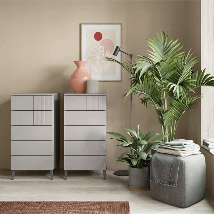 Il settimino moderno presenta 5 capienti cassetti dotati di apertura push pull e guide in metallo ammortizzate, per un corretto utilizzo nel tempo. La finitura proposta in Grigio dorian può essere sostituita con altre tonalità, per personalizzare al massimo la propria camera da letto.