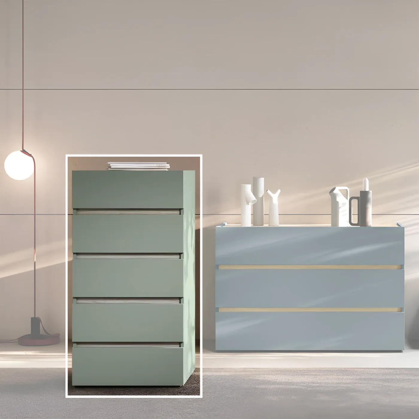 Il settimino si distingue per il suo design moderno e minimalista, caratterizzato da linee pulite e forme geometriche. Il colore agave (un verde chiaro e delicato) e il bianco altea (un bianco caldo e luminoso) creano un'atmosfera rilassante e sofisticata all'ambiente.