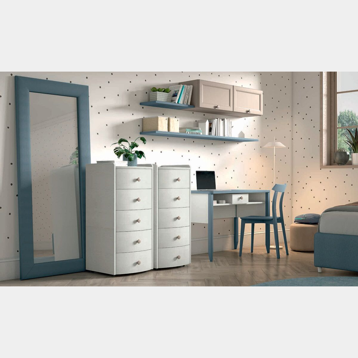 L'effetto venato della tinta Bucaneve dona luce e calore all'ambiente, assicurando così un perfetto inserimento del settimino in diversi contesti, come ad esempio una camera matrimoniale oppure una cameretta di un bambino o ragazzo. Sono disponibili altre due finiture effetto legno, più escure: Magnolia e Noce sorrento (con supplemento).