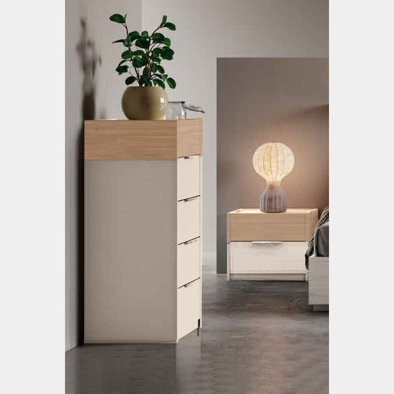 La parte inferiore è composta da 4 cassetti Orzo con maniglia dedicata in metallo cromato. La parte superiore invece ha anch'essa un cassetto con maniglia a presa superiore e scocca e cassetto in Essenza Noce Biondo. Al mobile è possibile aggiungere come OPTIONAL dei kit ammortizzatori per le guide dei cassetti.